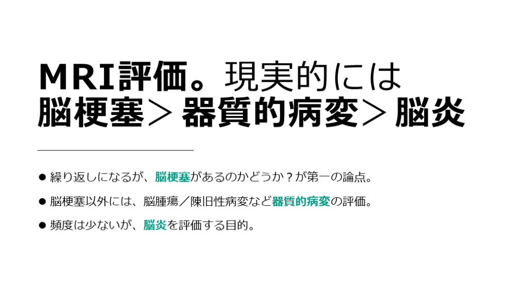 脳梗塞>器質的病変>脳炎 繰り返しになるが、脳梗塞があるのかどうか?が第一の論点。