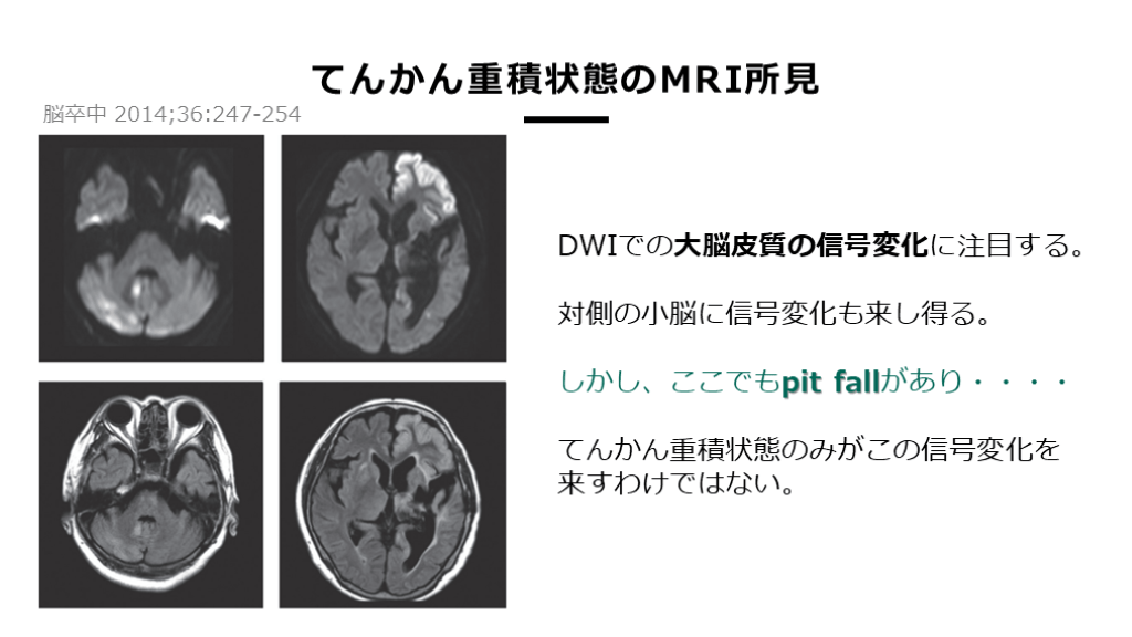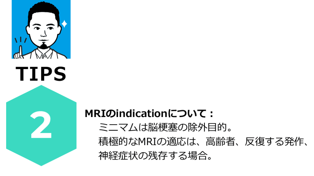けいれん対応のみならず、その原因が脳卒中であった場合には、脳卒中の治療を行わなければならない。まず、脳卒中の可能性について検討すべく、MRI評価をする必要がある。