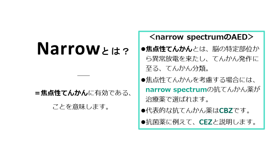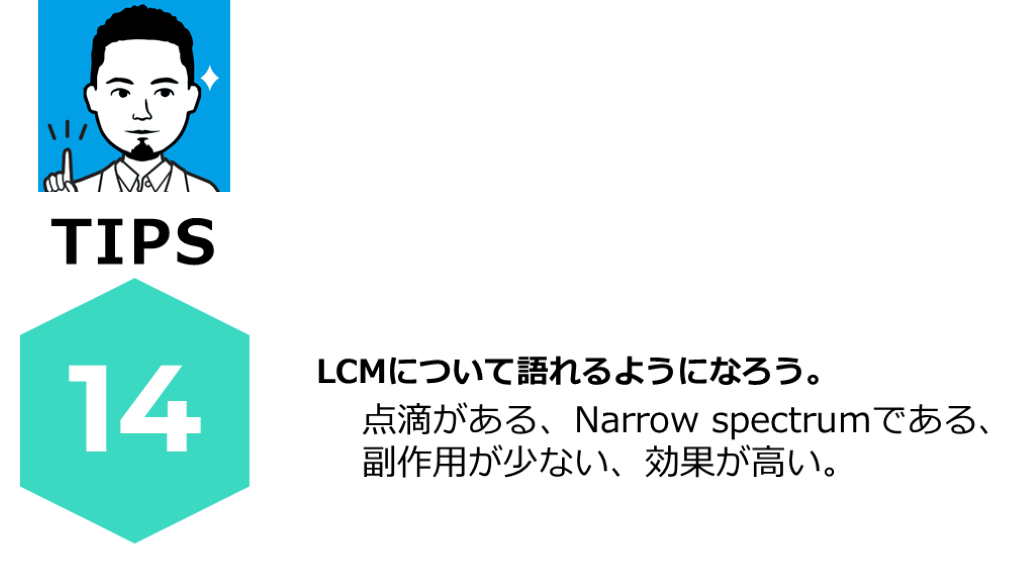 点滴がある、Narrow spectrumである、副作用が少ない、効果が高い。 TIPS 14