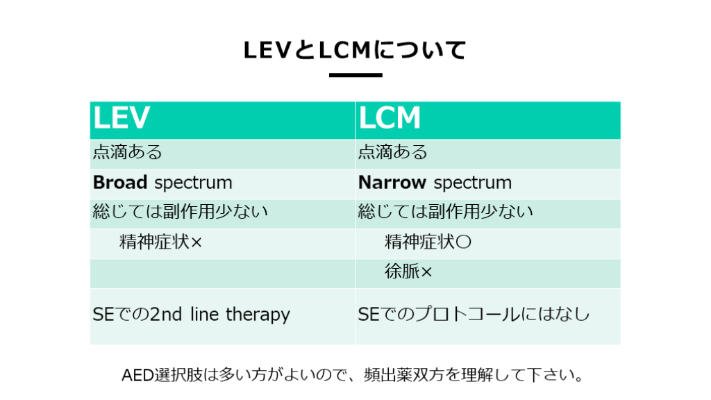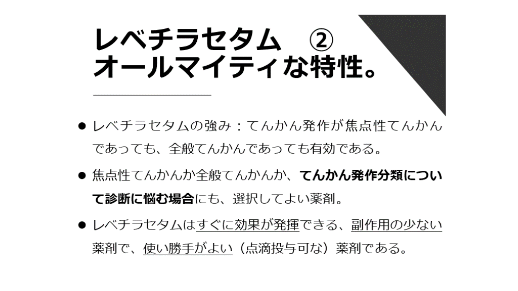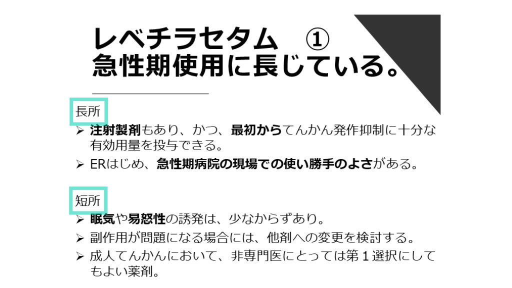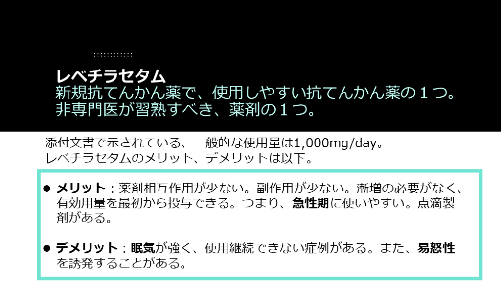 レベチラセタムはすぐに効果が発揮できる、副作用の少ない薬剤で、使い勝手がよい(点滴投与可な)薬剤である。
