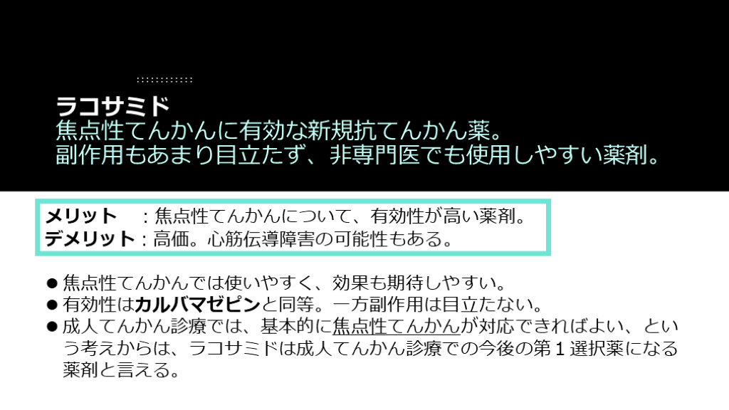 成人てんかん診療では、基本的に焦点性てんかんが対応できればよい、という考えからは、ラコサミドは成人てんかん診療での今後の第1選択薬になる薬剤と言える。 ラコサミド