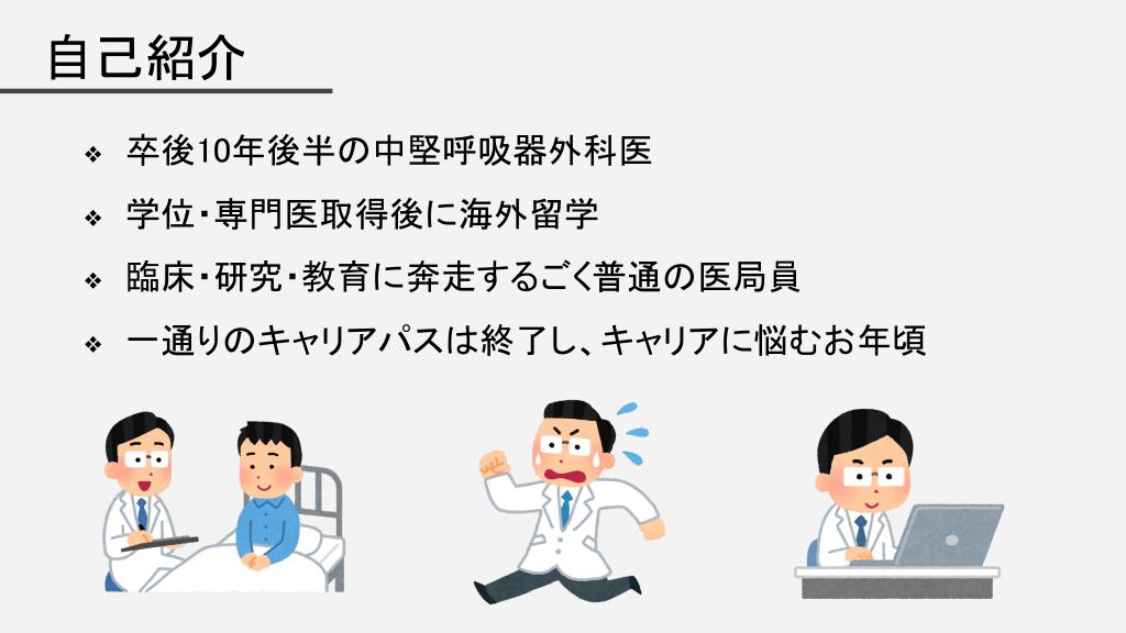 #2. 自己紹介 ❖ 卒後10年後半の中堅呼吸器外科医 ❖ 学位・専門医取得後に海外留学 ❖ 臨床・研究・教育に奔走するごく普通の医局員 ❖ 一通りのキャリアパスは終了し、キャリアに悩むお年頃