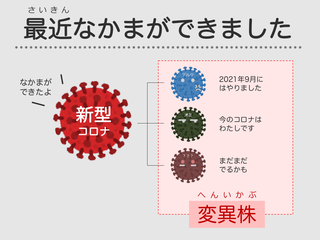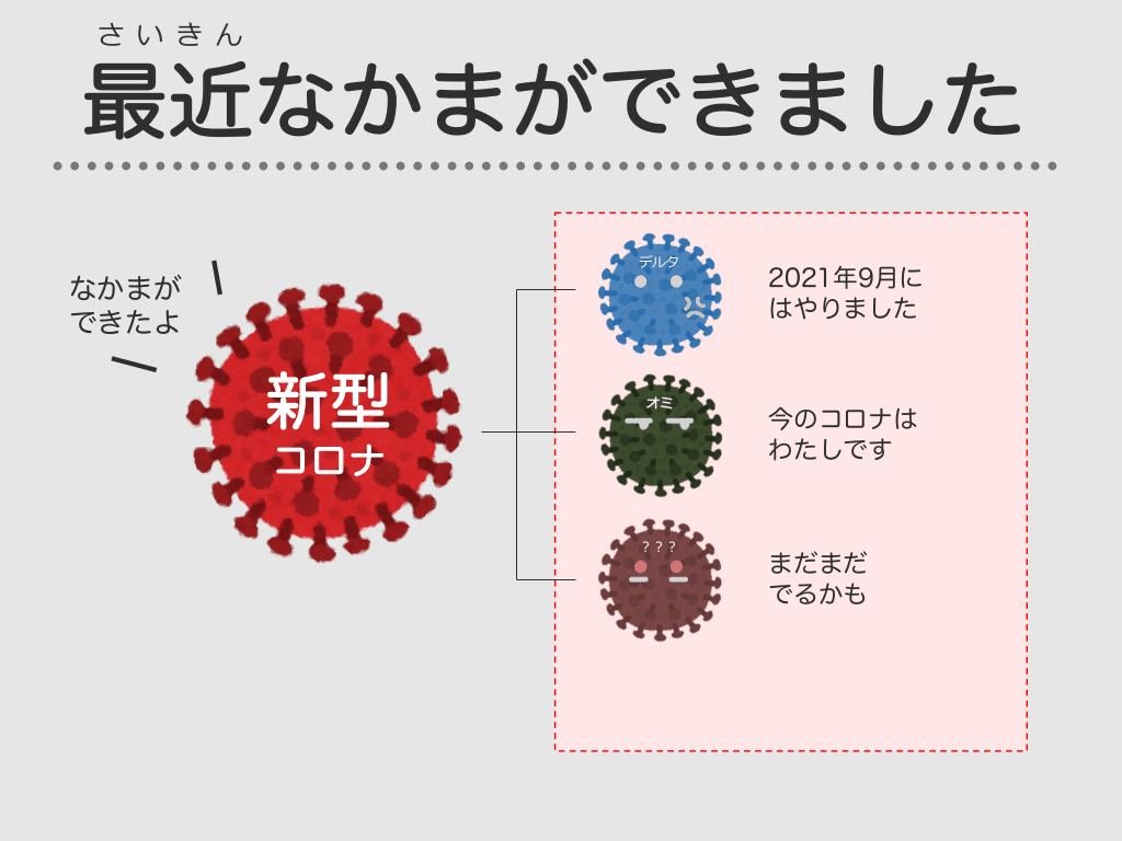 #10. さ い き ん 最近なかまができました デルタ なかまが できたよ 新型 2021年9月に はやりました 今のコロナは わたしです コロナ ︖︖︖ まだまだ でるかも