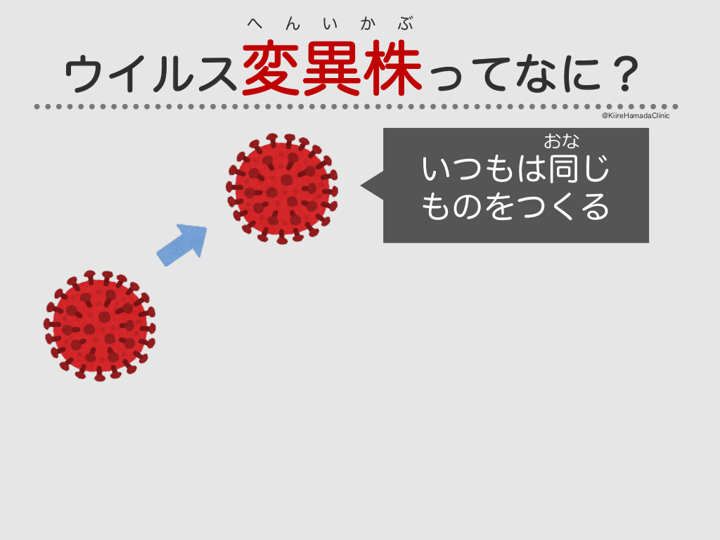 #13. へ ん い か ぶ ウイルス変異株ってなに? @KiireHamadaClinic おな いつもは同じ ものをつくる