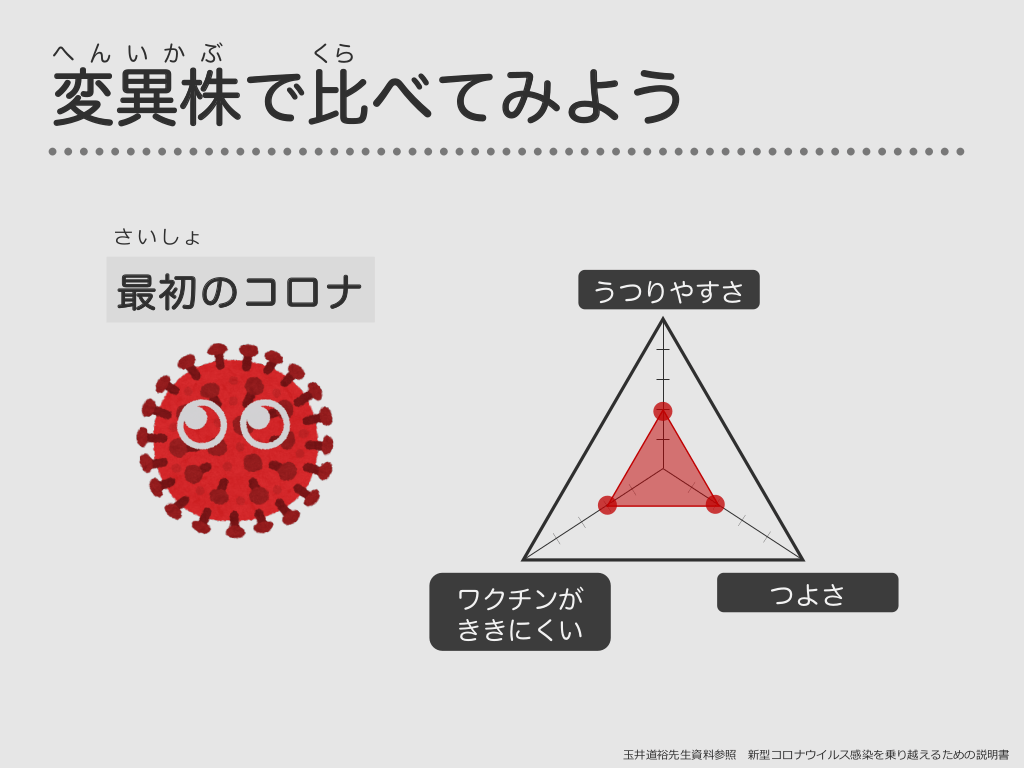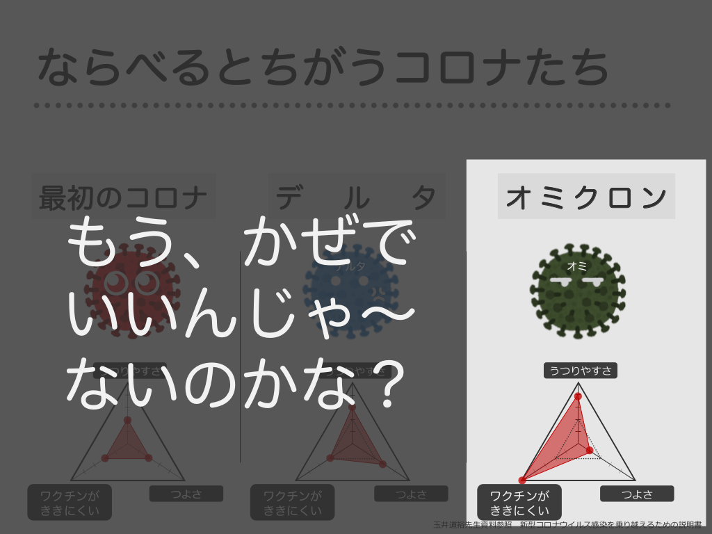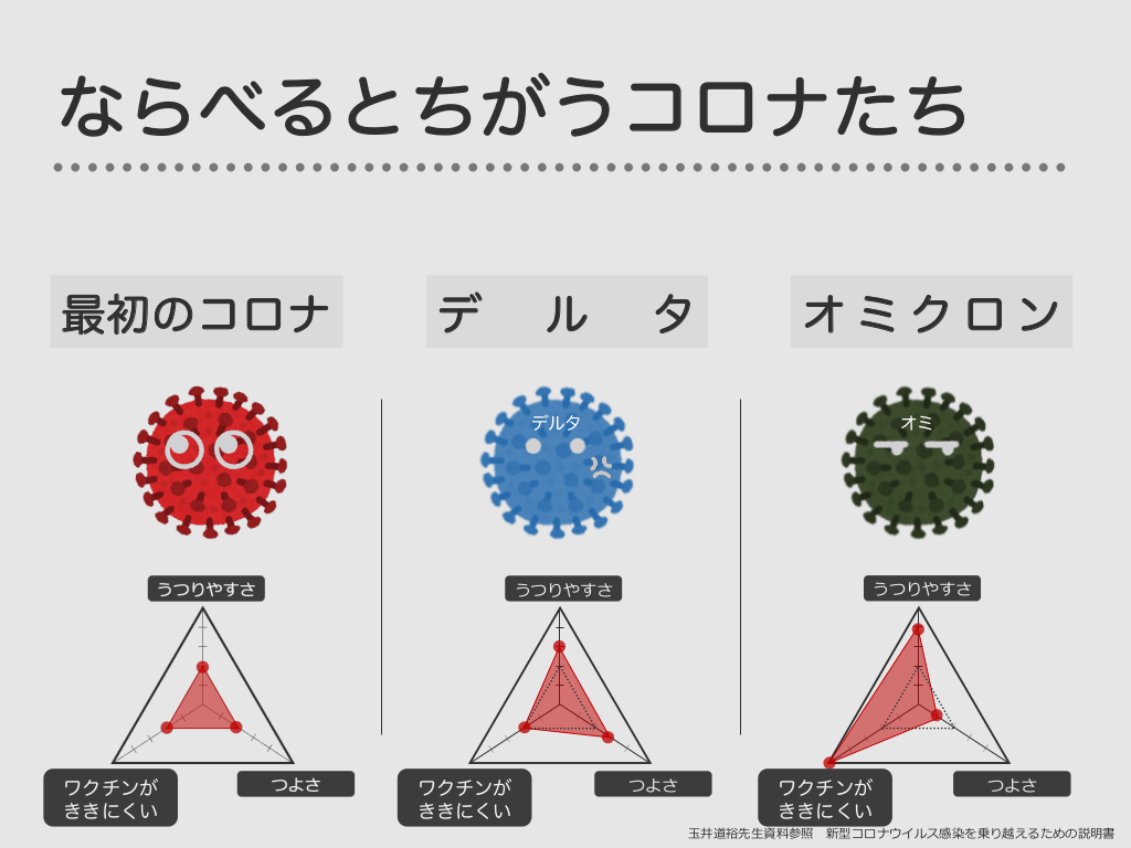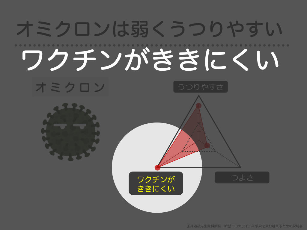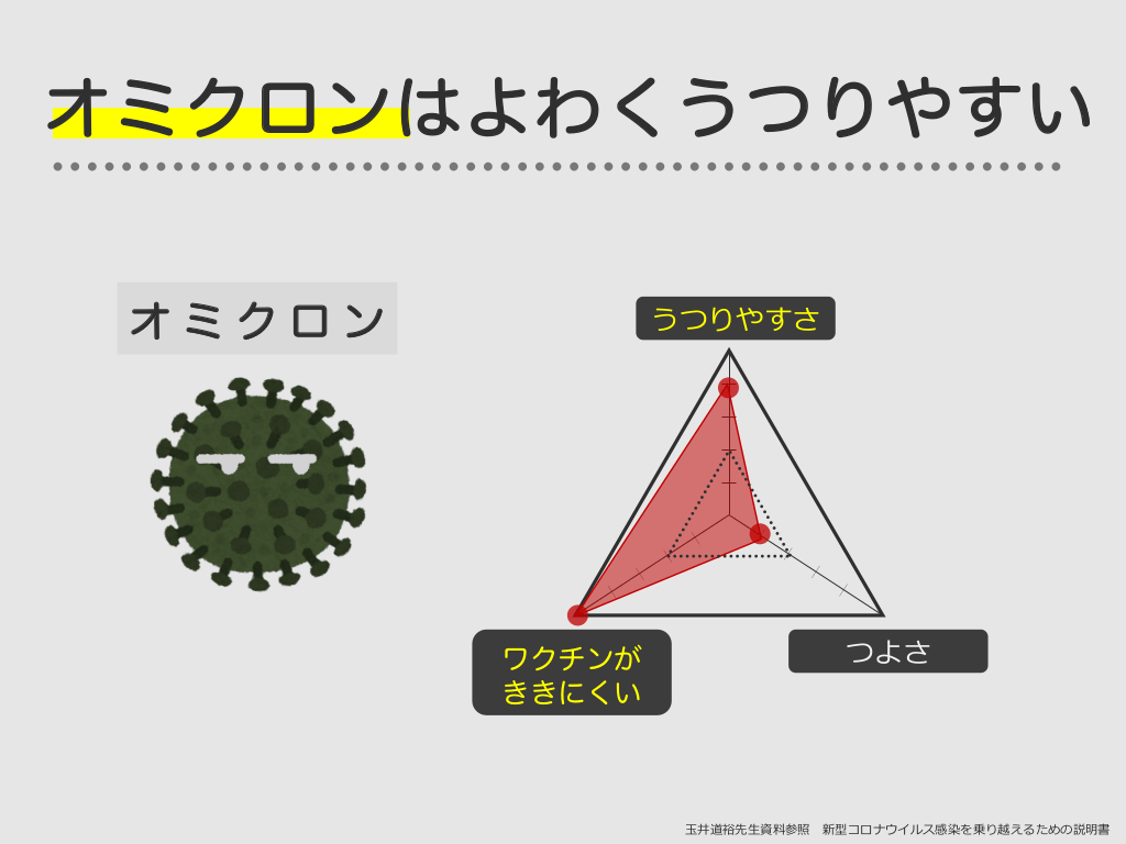 #18. オミクロンはよわくうつりやすい オミクロン うつりやすさ ワクチンが ききにくい つよさ ⽟井道裕先⽣資料参照 新型コロナウイルス感染を乗り越えるための説明書