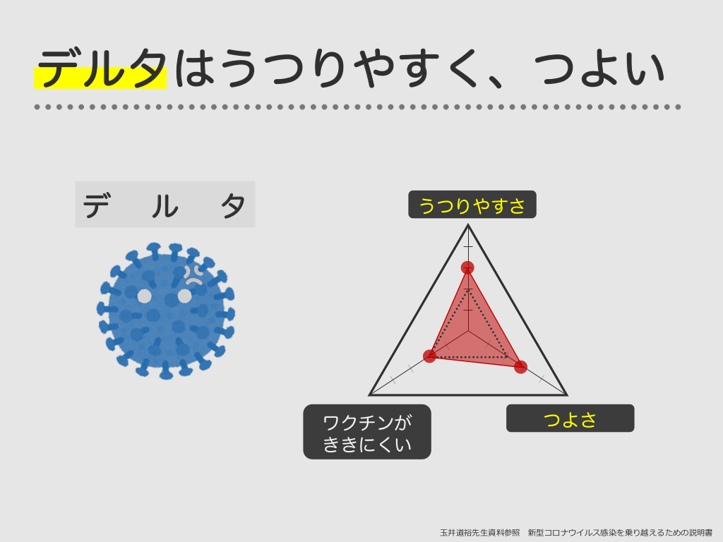 #17. デルタはうつりやすく、つよい デ ル タ うつりやすさ ワクチンが ききにくい つよさ ⽟井道裕先⽣資料参照 新型コロナウイルス感染を乗り越えるための説明書