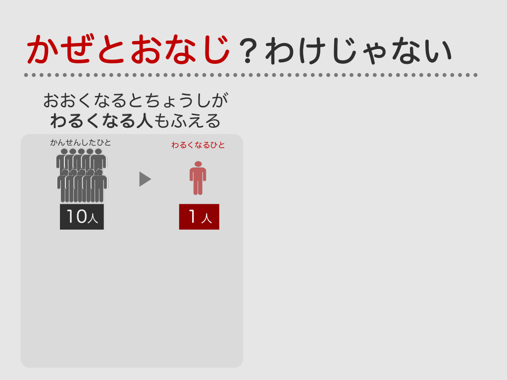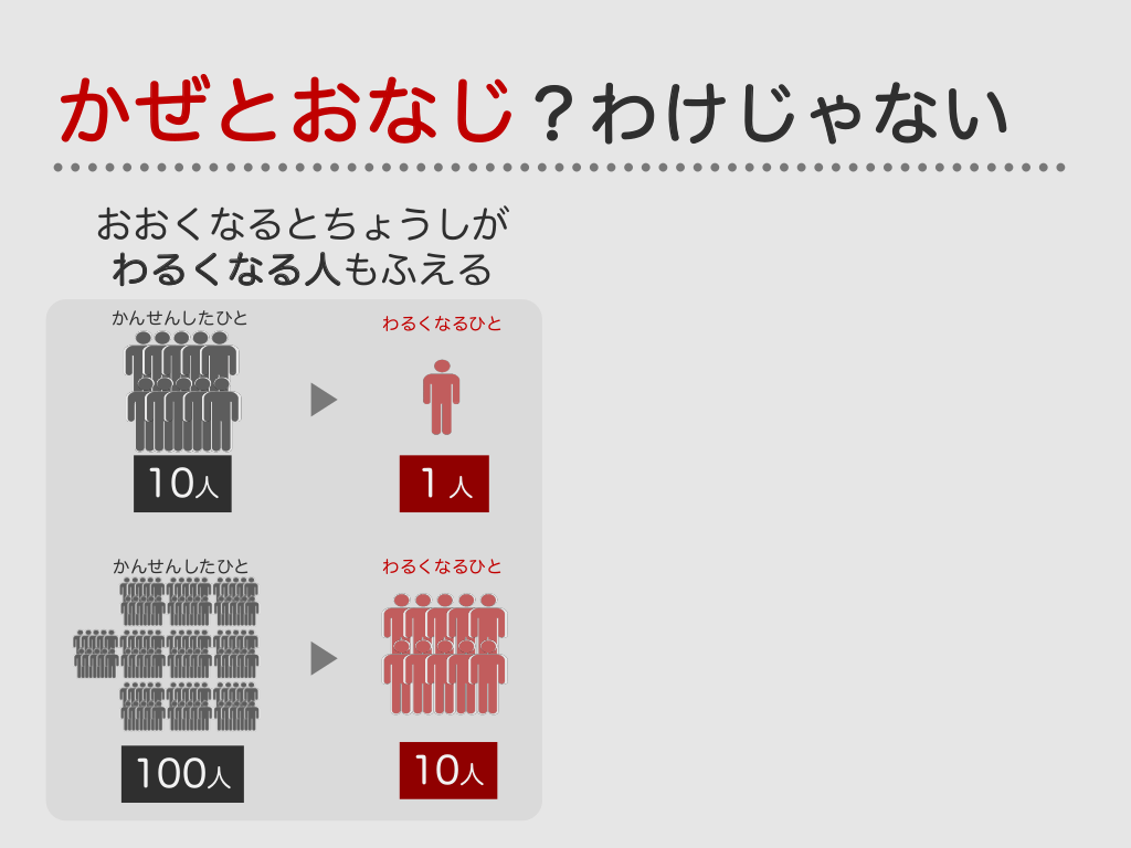 #23. かぜとおなじ?わけじゃない おおくなるとちょうしが わるくなる人もふえる かんせんしたひと わるくなるひと 10人 1人 かんせんしたひと わるくなるひと 100人 10人