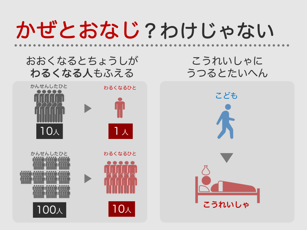 #24. かぜとおなじ?わけじゃない おおくなるとちょうしが わるくなる人もふえる かんせんしたひと こうれいしゃに うつるとたいへん わるくなるひと こども 10人 1人 かんせんしたひと わるくなるひと 100人 10人 こうれいしゃ