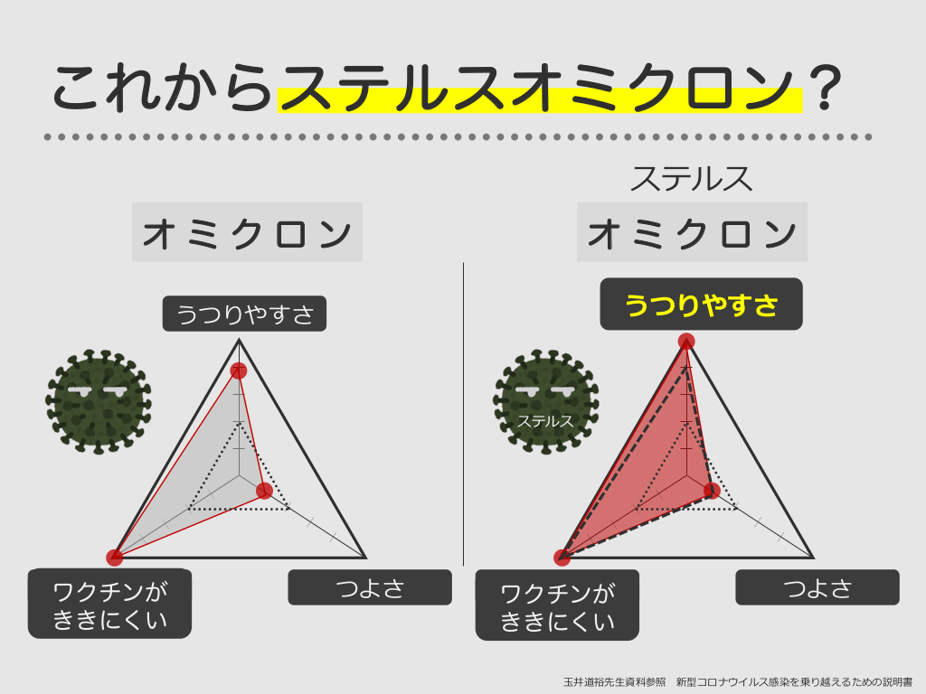 #25. これからステルスオミクロン? ステルス オミクロン オミクロン うつりやすさ うつりやすさ ステルス 対ワクチン⼒ ワクチンが ききにくい つよさ 対ワクチン⼒ ワクチンが ききにくい つよさ ⽟井道裕先⽣資料参照 新型コロナウイルス感染を乗り越えるための説明書