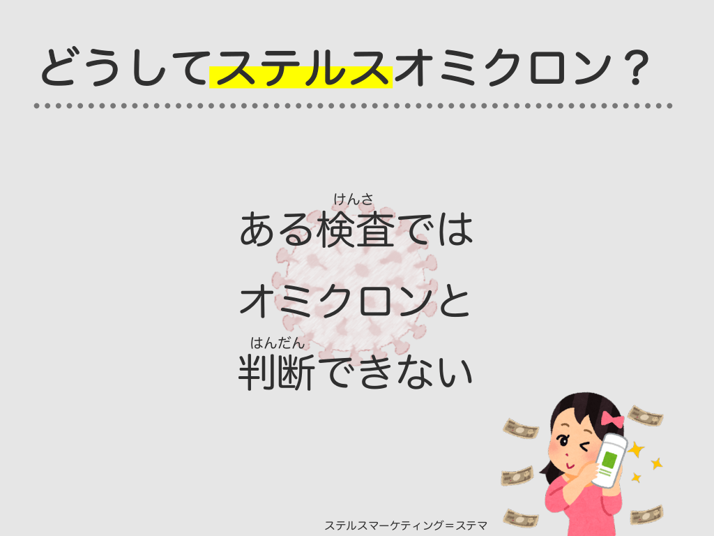 #26. どうしてステルスオミクロン? けんさ ある検査では オミクロンと はんだん 判断できない ステルスマーケティング=ステマ