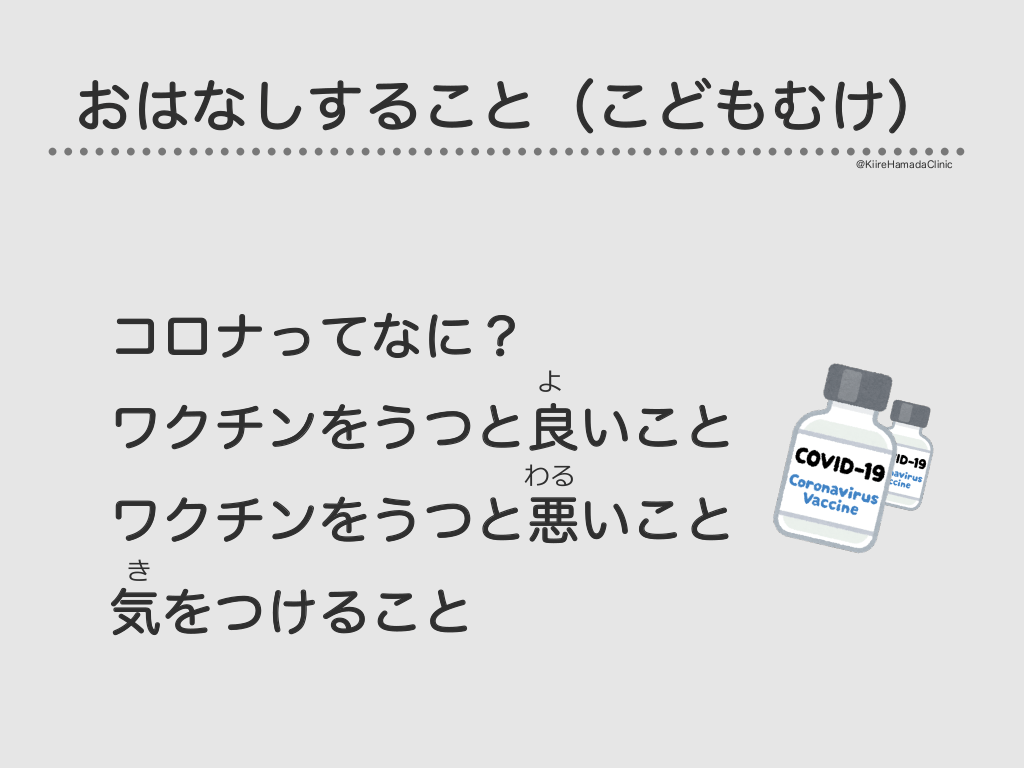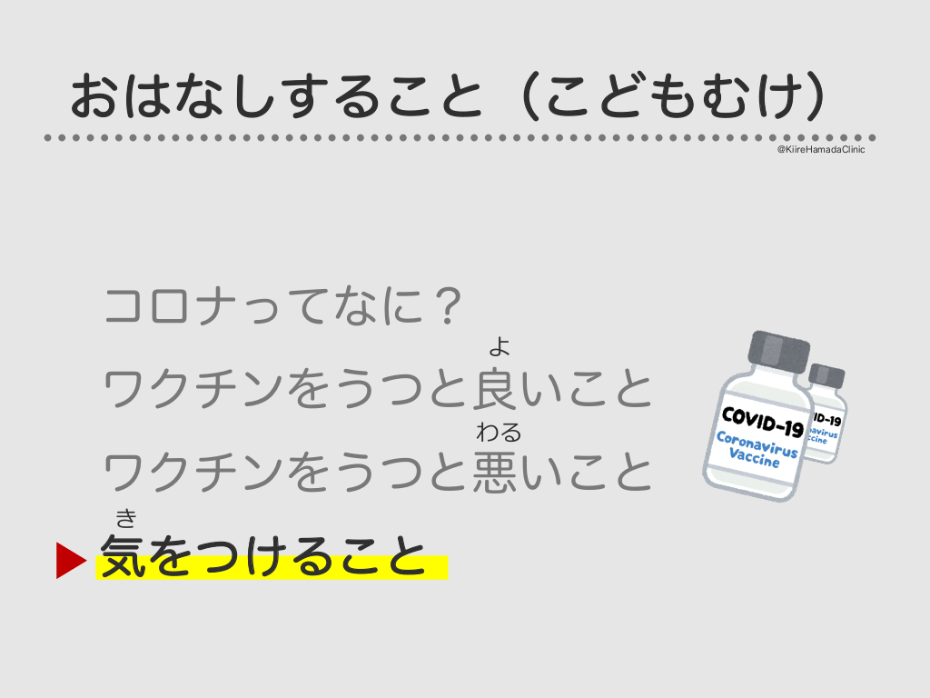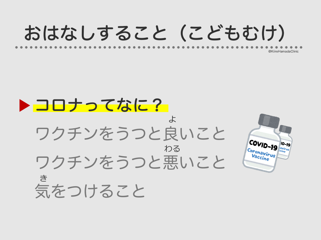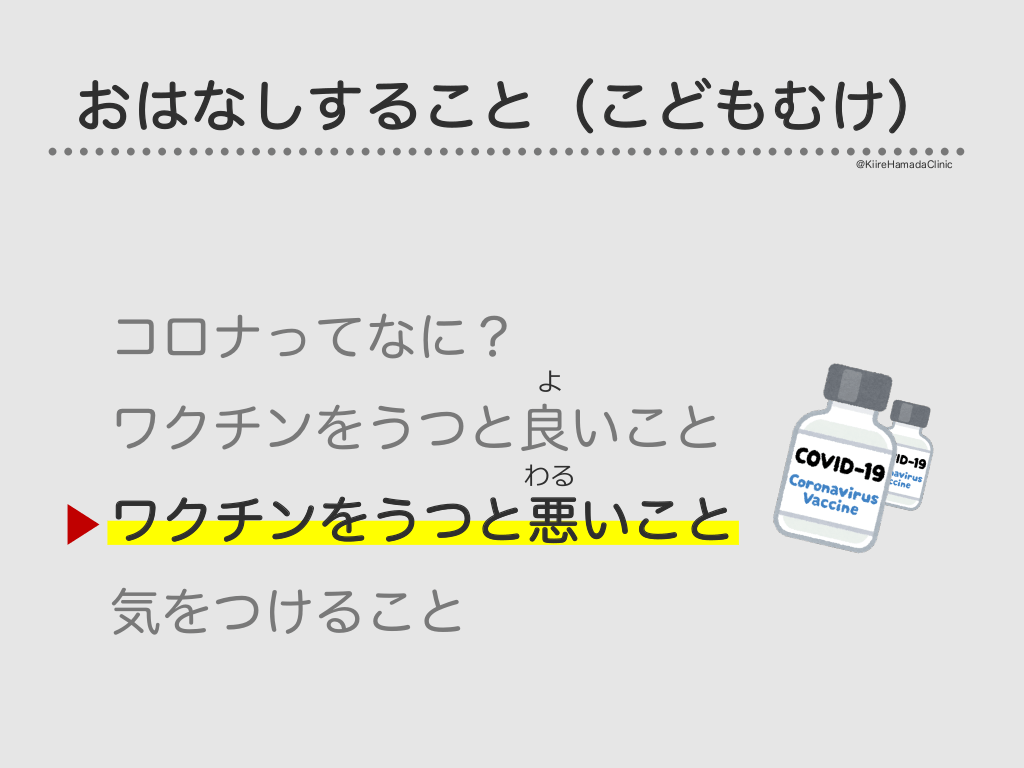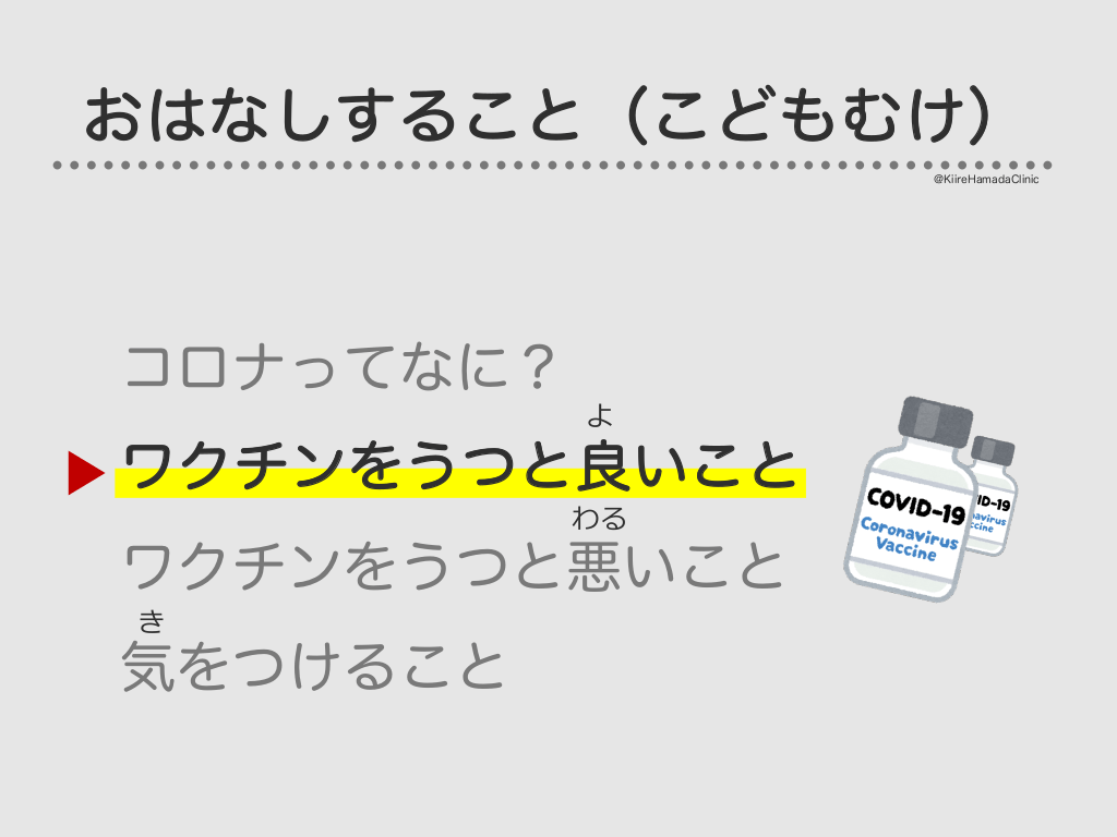 #7. おはなしすること(こどもむけ) @KiireHamadaClinic コロナってなに? よ ワクチンをうつと良いこと わる ワクチンをうつと悪いこと き 気をつけること