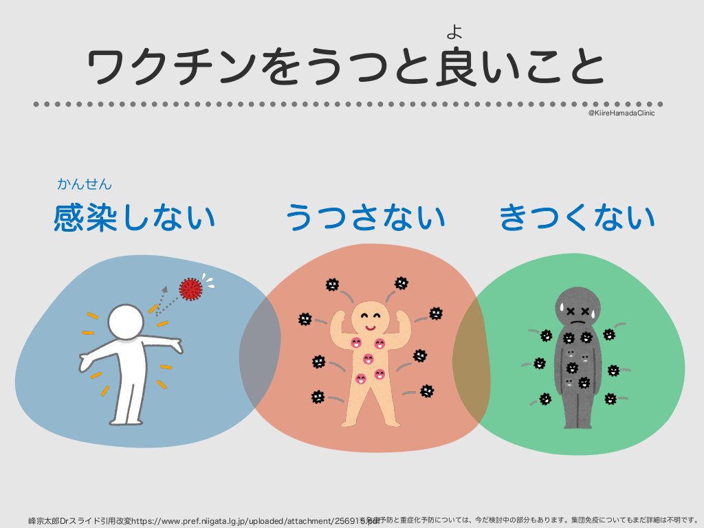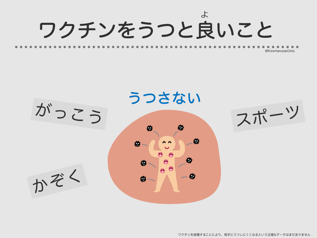 #31. よ ワクチンをうつと良いこと @KiireHamadaClinic がっこう うつさない ツ ー ポ ス く ぞ か ワクチンを接種することにより、相手にうつしにくくなるという正確なデータはまだありません