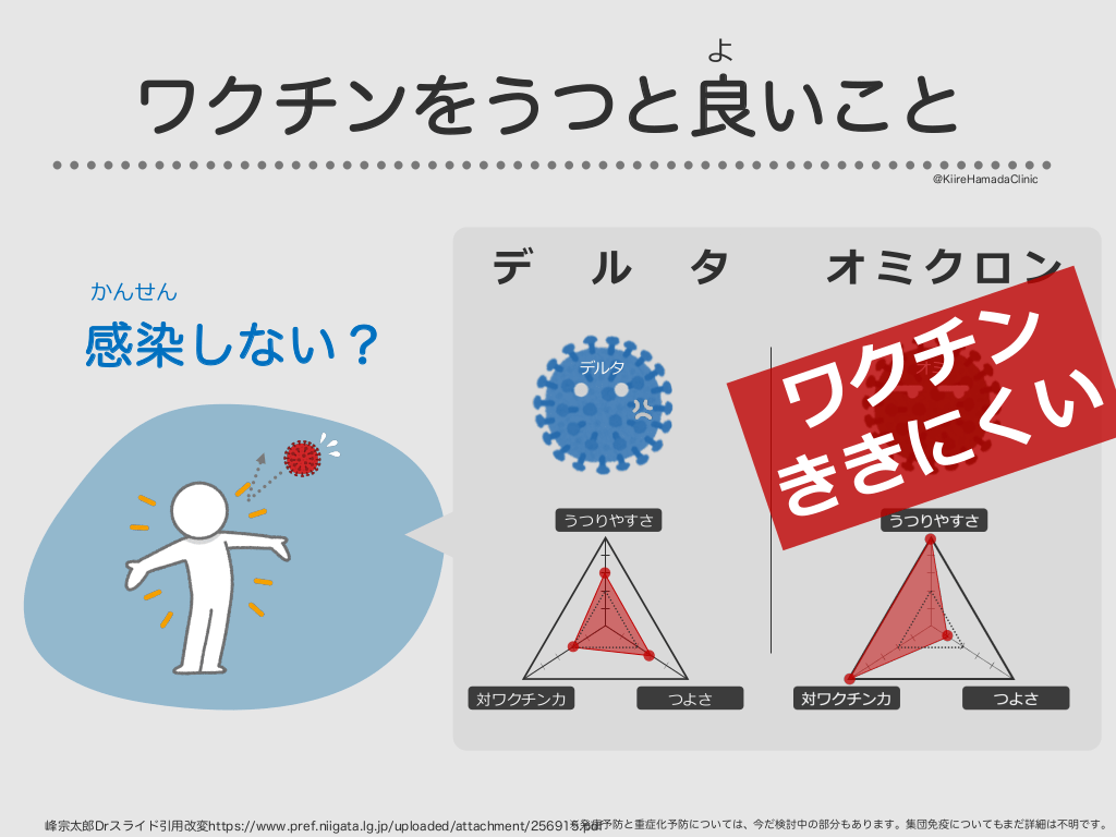 #30. よ ワクチンをうつと良いこと @KiireHamadaClinic かんせん デ ル 感染しない? タ デルタ ン チ ク ワ い く に きき オミ うつりやすさ 対ワクチン⼒ オミクロン つよさ ※発症予防と重症化予防については、今だ検討中の部分もあります。集団免疫についてもまだ詳細は不明です。 峰宗太郎Drスライド引用改変https://www.pref.niigata.lg.jp/uploaded/attachment/256915.pdf