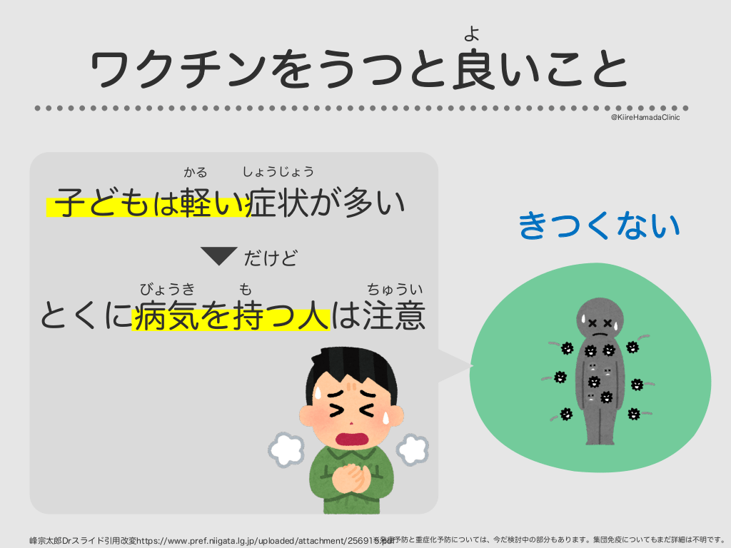 #32. よ ワクチンをうつと良いこと @KiireHamadaClinic かる しょうじょう 子どもは軽い症状が多い きつくない だけど びょうき も ちゅうい とくに病気を持つ人は注意 ※発症予防と重症化予防については、今だ検討中の部分もあります。集団免疫についてもまだ詳細は不明です。 峰宗太郎Drスライド引用改変https://www.pref.niigata.lg.jp/uploaded/attachment/256915.pdf
