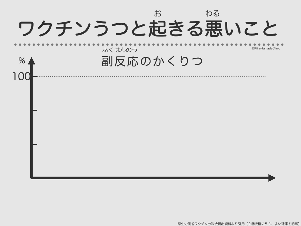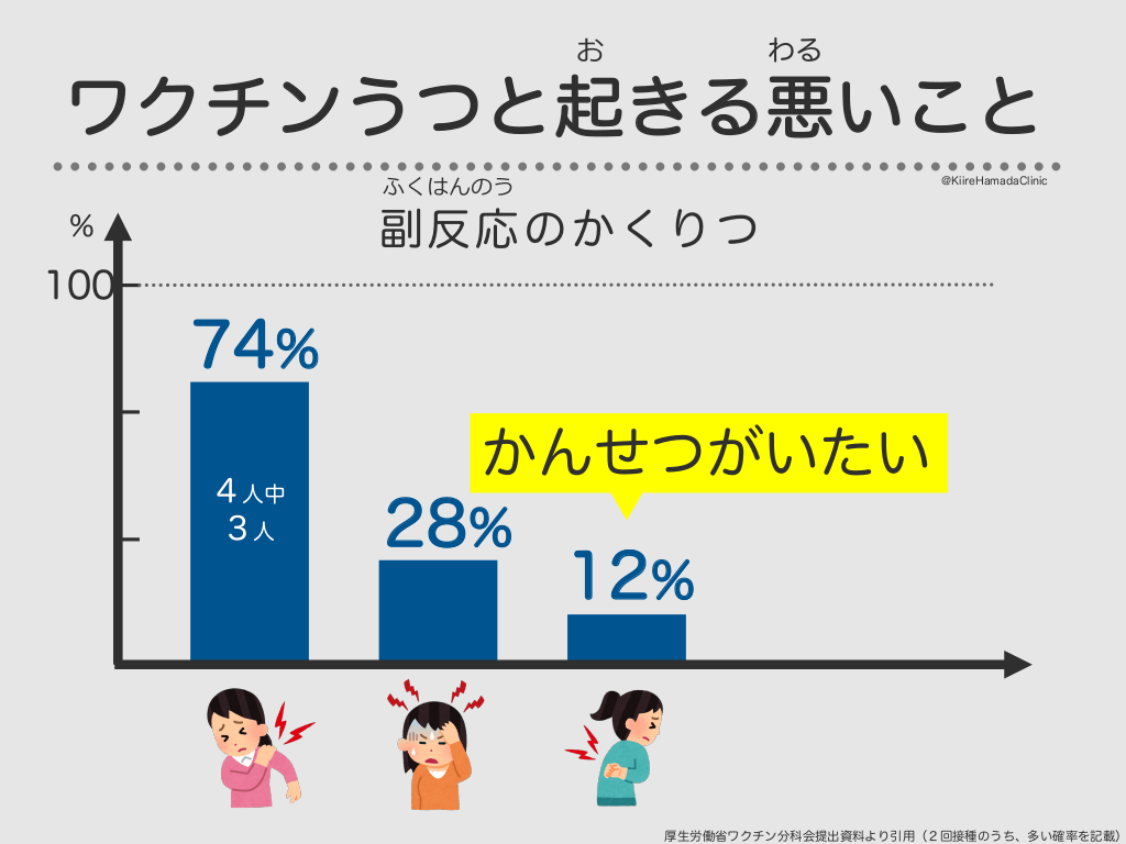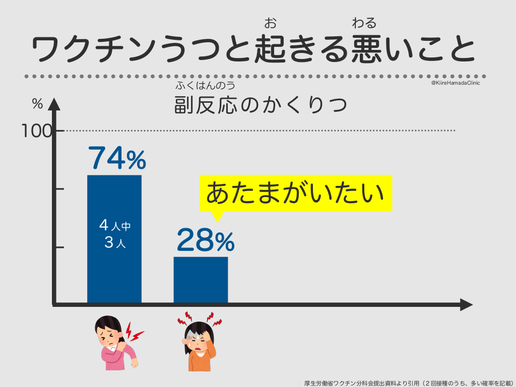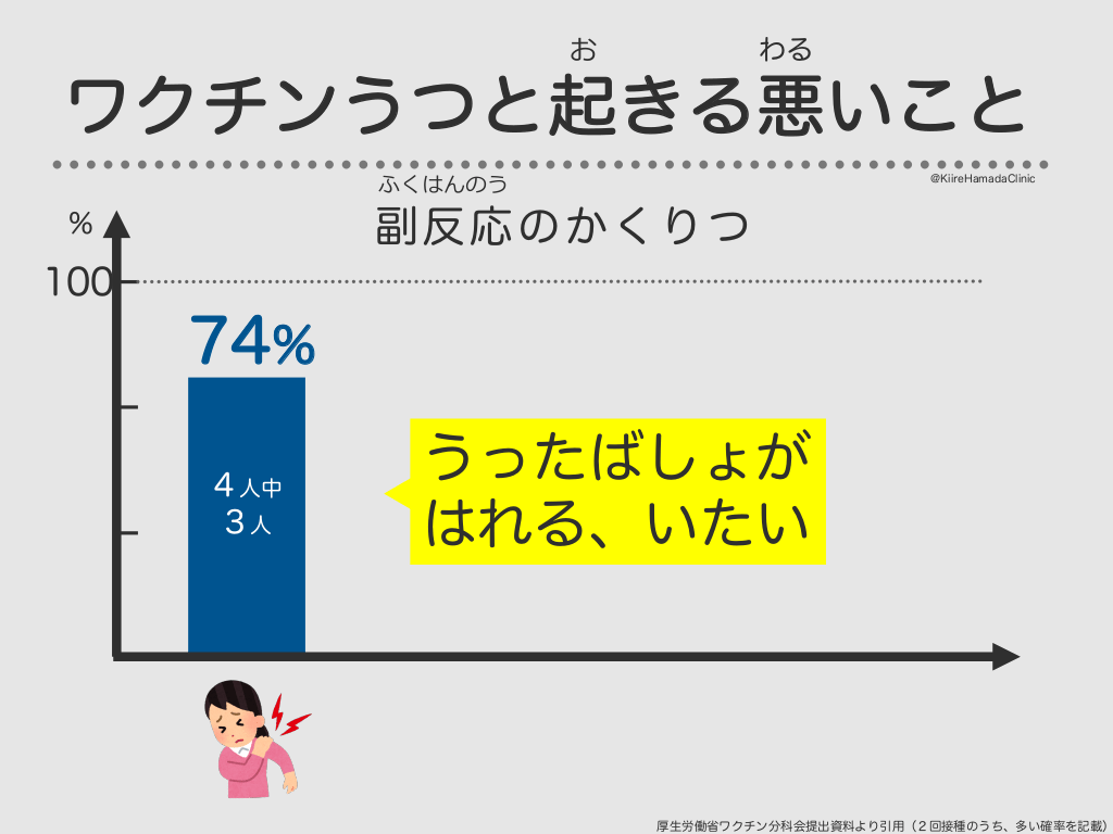#35. お わる ワクチンうつと起きる悪いこと ふくはんのう @KiireHamadaClinic 副反応のかくりつ % 100 74% 4人中 3人 うったばしょが はれる、いたい 厚生労働省ワクチン分科会提出資料より引用(2回接種のうち、多い確率を記載)