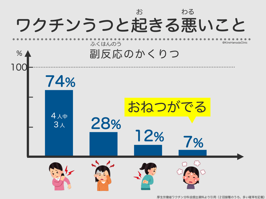 #38. お わる ワクチンうつと起きる悪いこと ふくはんのう @KiireHamadaClinic 副反応のかくりつ % 100 74% 4人中 3人 おねつがでる 28% 12% 7% 厚生労働省ワクチン分科会提出資料より引用(2回接種のうち、多い確率を記載)
