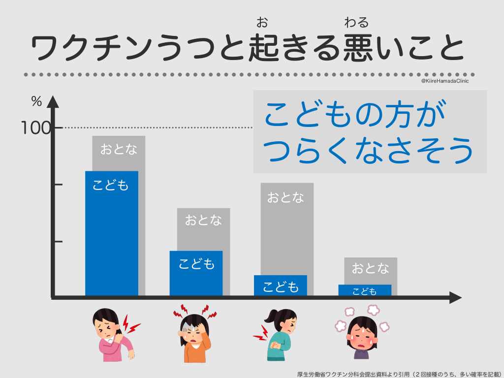 #39. お わる ワクチンうつと起きる悪いこと @KiireHamadaClinic % こどもの方が つらくなさそう 100 おとな こども おとな おとな こども おとな こども こども 厚生労働省ワクチン分科会提出資料より引用(2回接種のうち、多い確率を記載)