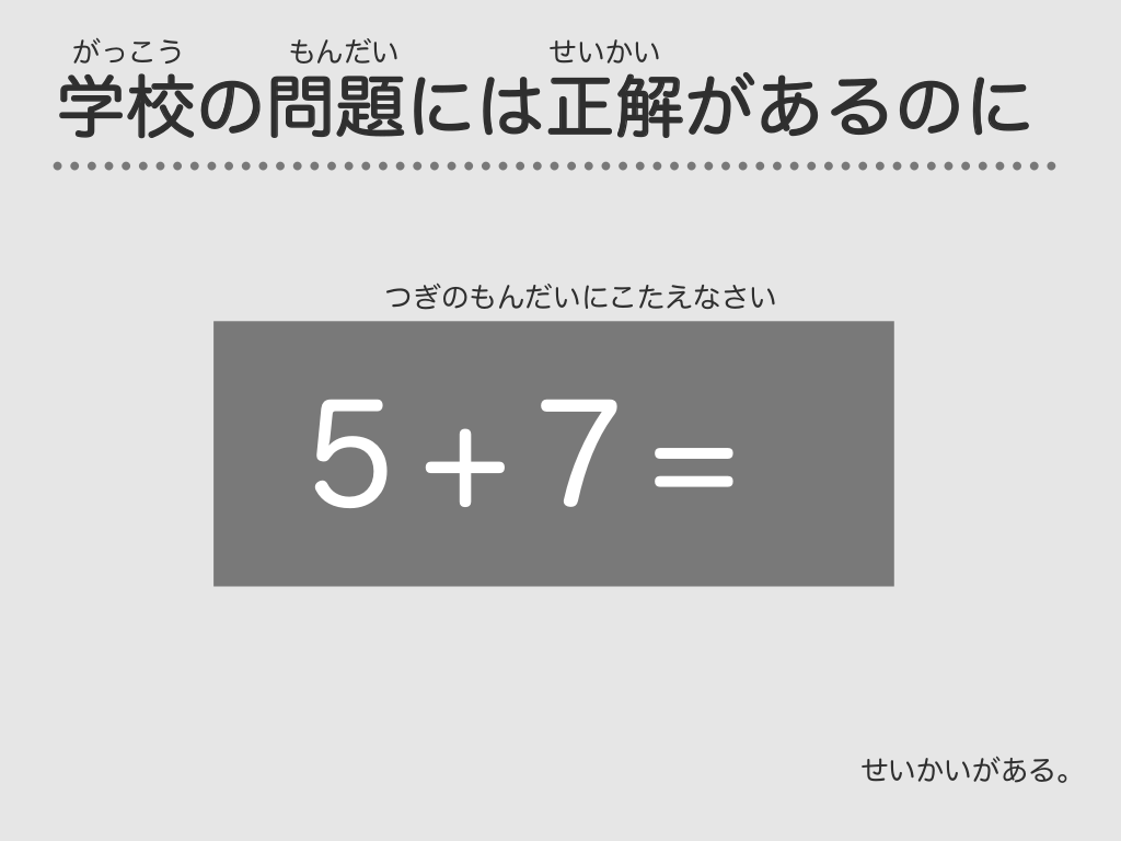 #4. がっこう もんだい せいかい 学校の問題には正解があるのに つぎのもんだいにこたえなさい 5+7= せいかいがある。