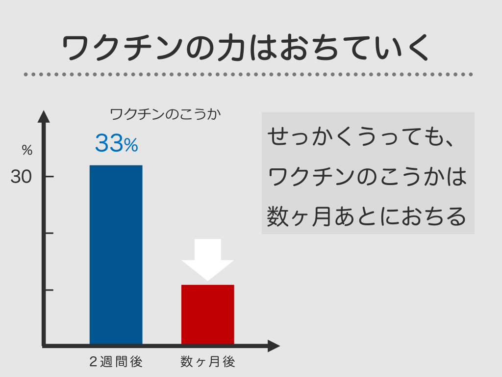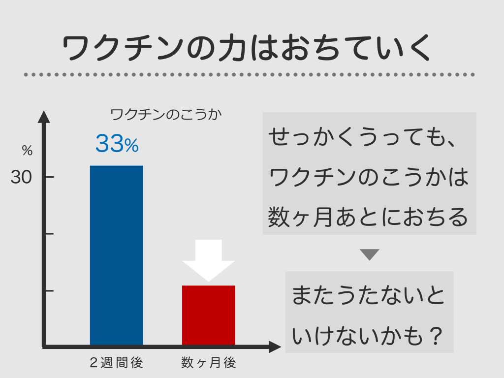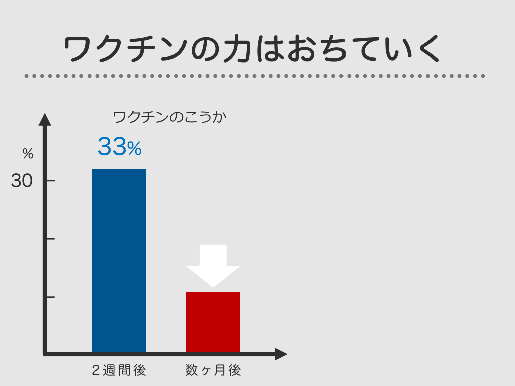 #40. ワクチンの力はおちていく ワクチンのこうか % 33% 30 2週間後 数ヶ月後