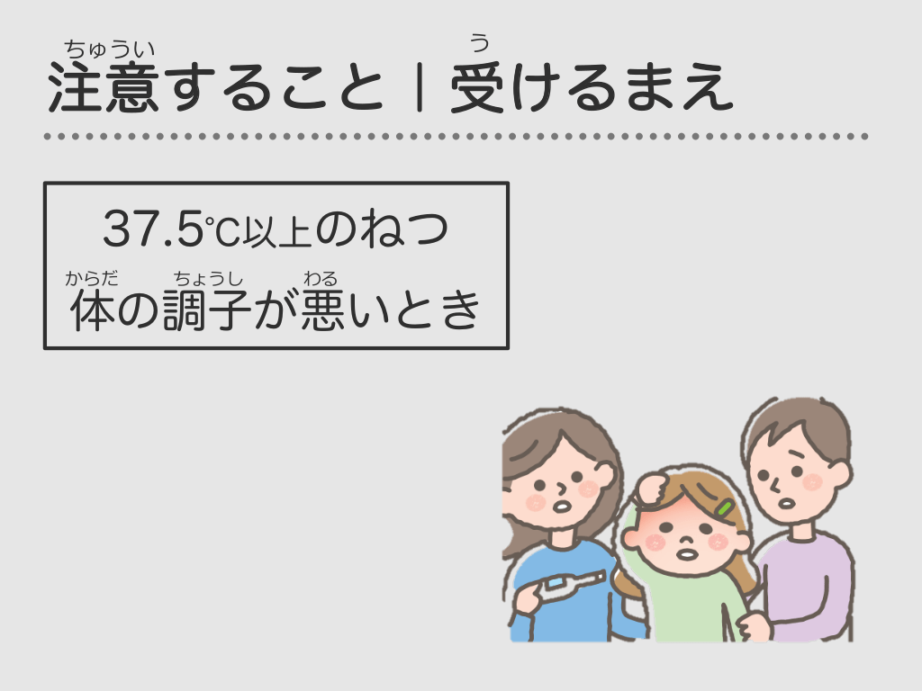 #44. う ちゅうい 注意すること|受けるまえ 37.5℃以上のねつ からだ ちょうし わる 体の調子が悪いとき