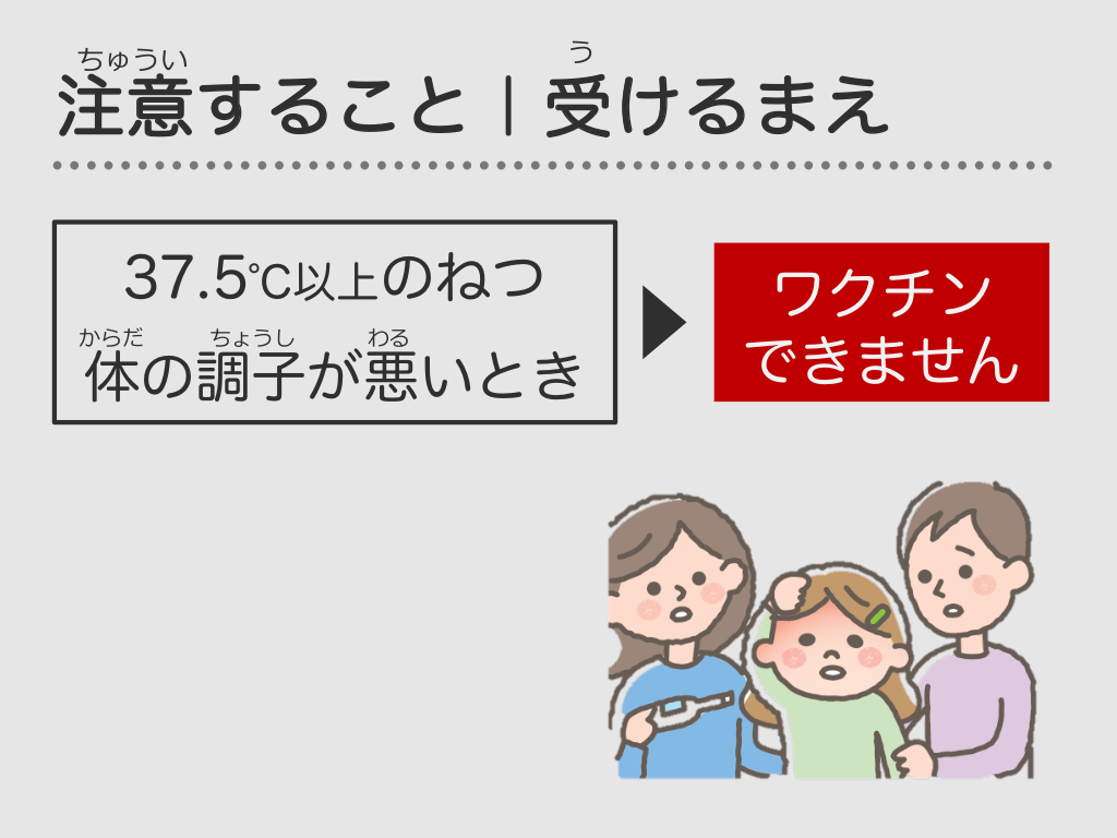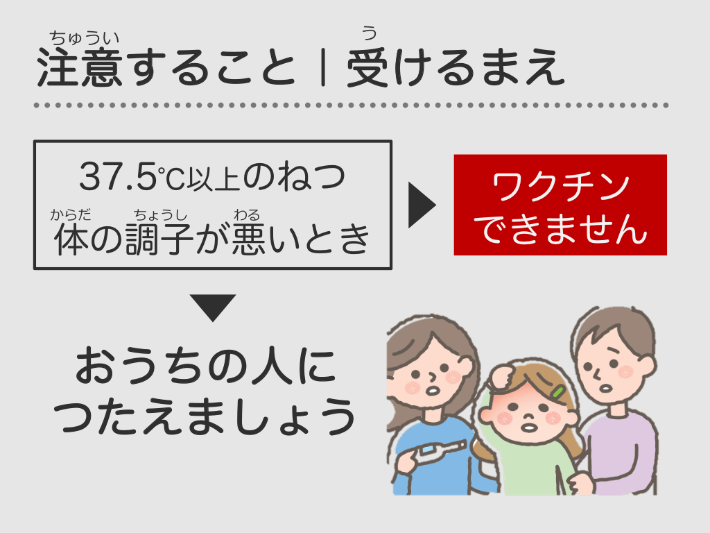 #46. う ちゅうい 注意すること|受けるまえ 37.5℃以上のねつ からだ ちょうし わる 体の調子が悪いとき おうちの人に つたえましょう ワクチン できません