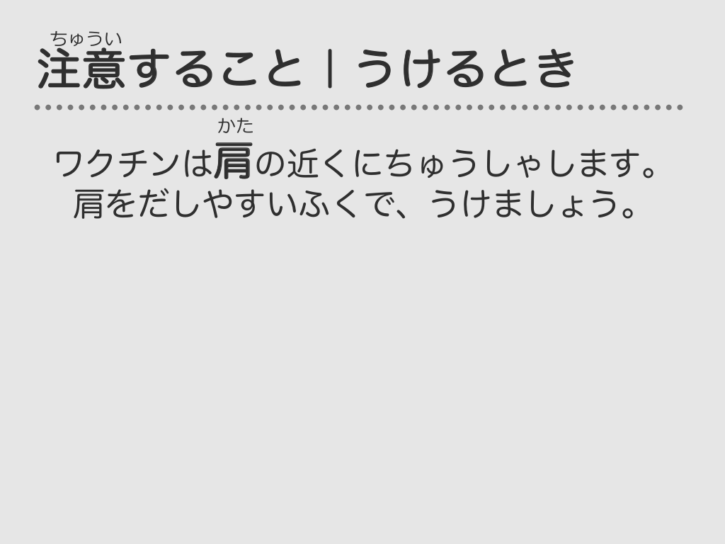 #47. ちゅうい 注意すること|うけるとき かた ワクチンは肩の近くにちゅうしゃします。 肩をだしやすいふくで、うけましょう。
