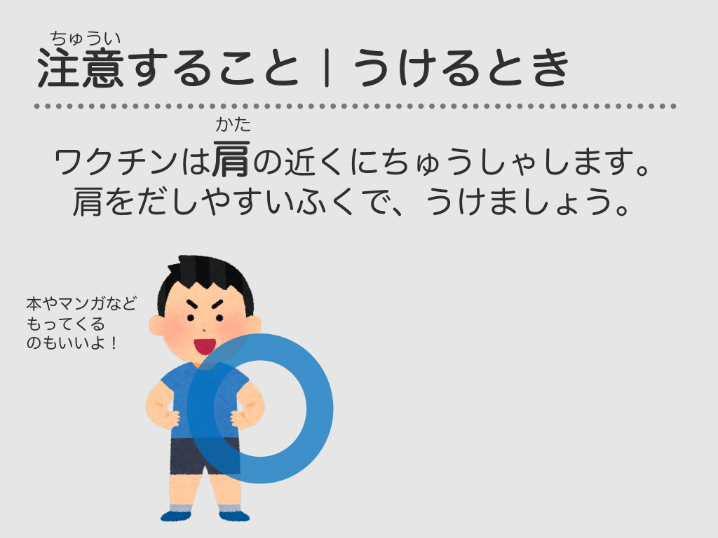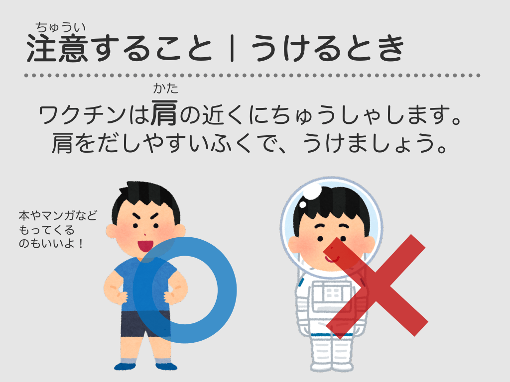 #49. ちゅうい 注意すること|うけるとき かた ワクチンは肩の近くにちゅうしゃします。 肩をだしやすいふくで、うけましょう。 本やマンガなど もってくる のもいいよ!