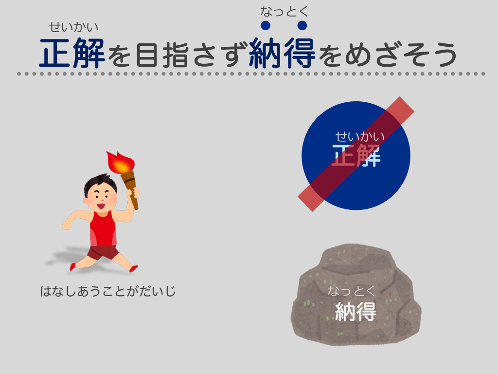 #5. せいかい なっとく 正解 を 目指さず 納得 を めざそう せいかい 正解 はなしあうことがだいじ なっとく 納得
