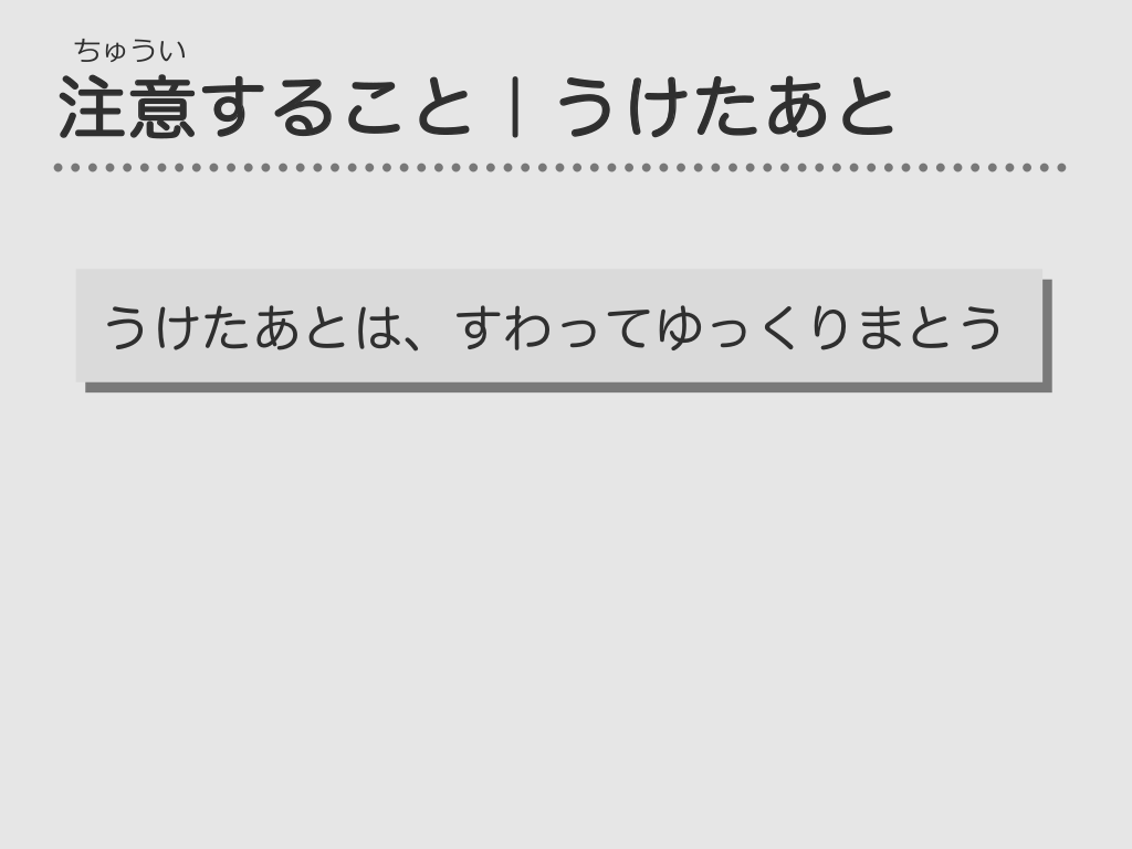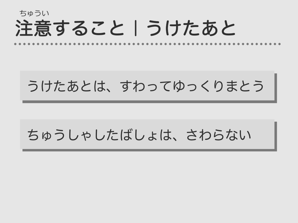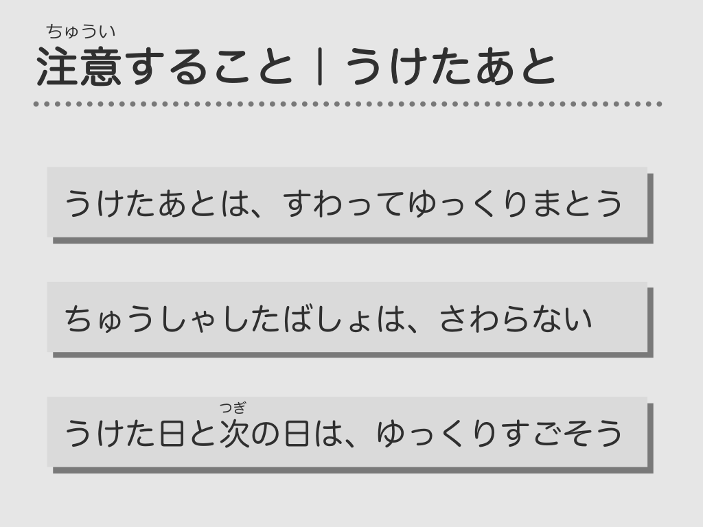 #51. ちゅうい 注意すること|うけたあと うけたあとは、すわってゆっくりまとう ちゅうしゃしたばしょは、さわらない