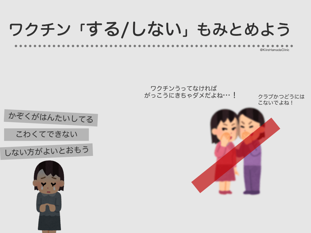 #54. ワクチン「する/しない」もみとめよう @KiireHamadaClinic ワクチンうってなければ がっこうにきちゃダメだよね…! かぞくがはんたいして る こわくてできない しない方がよいとおもう クラブかつどうには こないでよね!