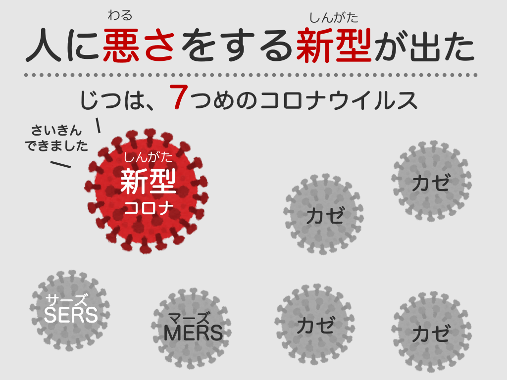 #9. わる しんがた 人に悪さをする新型が出た じつは、7つめのコロナウイルス さいきん できました しんがた 新型 コロナ カゼ カゼ サーズ SERS マーズ MERS カゼ カゼ