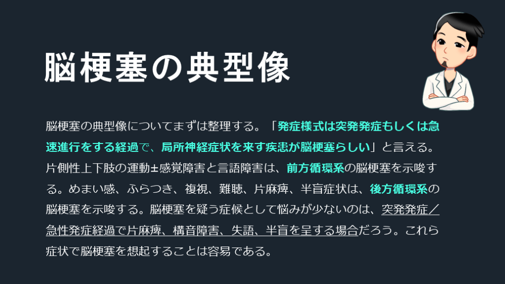 #4. 脳梗塞の典型像についてまずは整理する。「発症様式は突発発症もしくは急速進行をする経過で、局所神経症状を来す疾患が脳梗塞らしい」と言える。片側性上下肢の運動±感覚障害と言語障害は、前方循環系の脳梗塞を示唆する。めまい感、ふらつき、複視、難聴、片麻痺、半盲症状は、後方循環系の脳梗塞を示唆する。脳梗塞を疑う症候として悩みが少ないのは、突発発症/急性発症経過で片麻痺、構音障害、失語、半盲を呈する場合だろう。これら症状で脳梗塞を想起することは容易である。 脳梗塞の典型像
