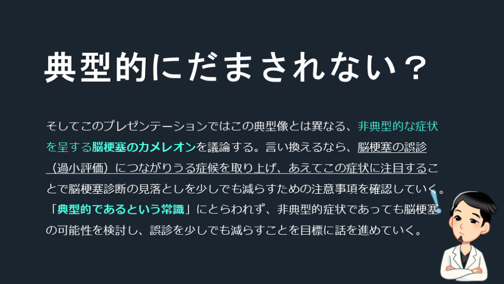 #5. 典型的にだまされない? そしてこのプレゼンテーションではこの典型像とは異なる、非典型的な症状を呈する脳梗塞のカメレオンを議論する。言い換えるなら、脳梗塞の誤診(過小評価)につながりうる症候を取り上げ、あえてこの症状に注目することで脳梗塞診断の見落としを少しでも減らすための注意事項を確認していく。「典型的であるという常識」にとらわれず、非典型的症状であっても脳梗塞の可能性を検討し、誤診を少しでも減らすことを目標に話を進めていく。