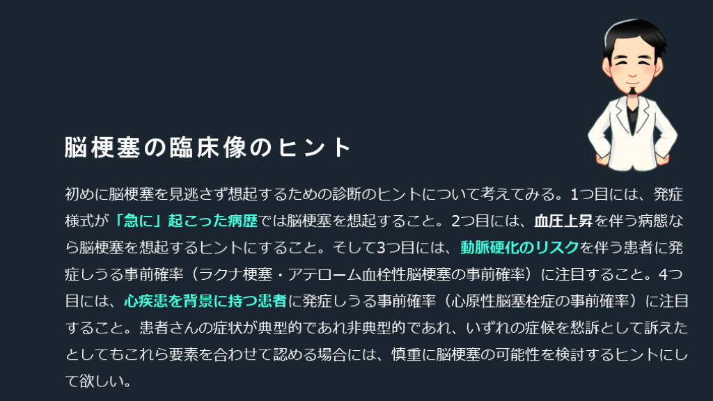 #6. 脳梗塞の臨床像のヒント 初めに脳梗塞を見逃さず想起するための診断のヒントについて考えてみる。1つ目には、発症様式が「急に」起こった病歴では脳梗塞を想起すること。2つ目には、血圧上昇を伴う病態なら脳梗塞を想起するヒントにすること。そして3つ目には、動脈硬化のリスクを伴う患者に発症しうる事前確率(ラクナ梗塞・アテローム血栓性脳梗塞の事前確率)に注目すること。4つ目には、心疾患を背景に持つ患者に発症しうる事前確率(心原性脳塞栓症の事前確率)に注目すること。患者さんの症状が典型的であれ非典型的であれ、いずれの症候を愁訴として訴えたとしてもこれら要素を合わせて認める場合には、慎重に脳梗塞の可能性を検討するヒントにして欲しい。