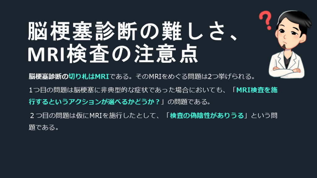 1つ目の問題は脳梗塞に非典型的な症状であった場合においても、「MRI検査を施行するというアクションが選べるかどうか?」の問題である。