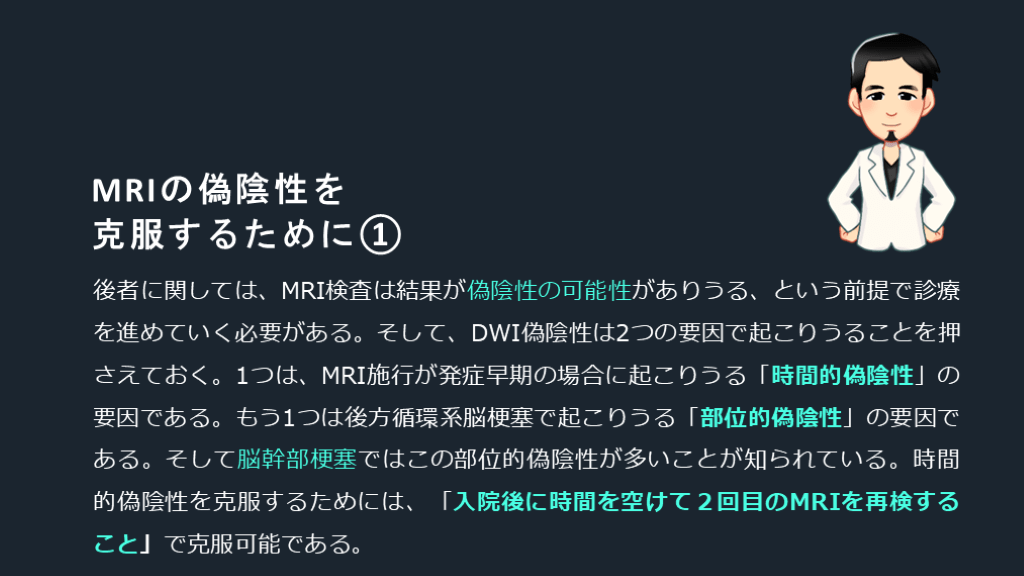 克服するために① 後者に関しては、MRI検査は結果が偽陰性の可能性がありうる、という前提で診療を進めていく必要がある。そして、DWI偽陰性は2つの要因で起こりうることを押さえておく。1つは、MRI施行が発症早期の場合に起こりうる「時間的偽陰性」の要因である。もう1つは後方循環系脳梗塞で起こりうる「部位的偽陰性」の要因である。そして脳幹部梗塞ではこの部位的偽陰性が多いことが知られている。時間的偽陰性を克服するためには、「入院後に時間を空けて2回目のMRIを再検すること」で克服可能である。