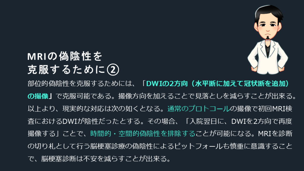 克服するために② 部位的偽陰性を克服するためには、「DWIの2方向(水平断に加えて冠状断を追加)の撮像」で克服可能である。撮像方向を加えることで見落としを減らすことが出来る。以上より、現実的な対応は次の如くとなる。通常のプロトコールの撮像で初回MRI検査におけるDWIが陰性だったとする。その場合、「入院翌日に、DWIを2方向で再度撮像する」ことで、時間的・空間的偽陰性を排除することが可能になる。MRIを診断の切り札として行う脳梗塞診療の偽陰性によるピットフォールも慎重に意識することで、脳梗塞診断は不安を減らすことが出来る。