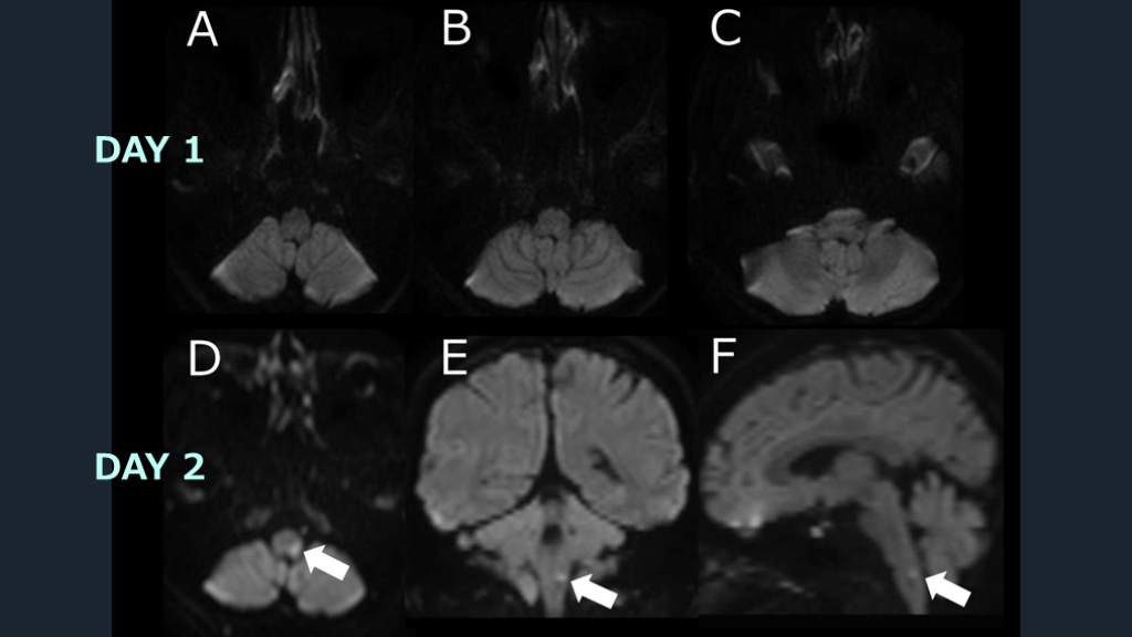 #34. 先述の如く、脳幹部梗塞疑いの場合には1度のMRI検査でも脳梗塞は否定しきれない、という意識は重要である。症候的に脳幹部梗塞の可能性が示唆されるにも関わらずDWI陰性だった場合には、2度目のMRI撮影を行うというアクションが重要である。