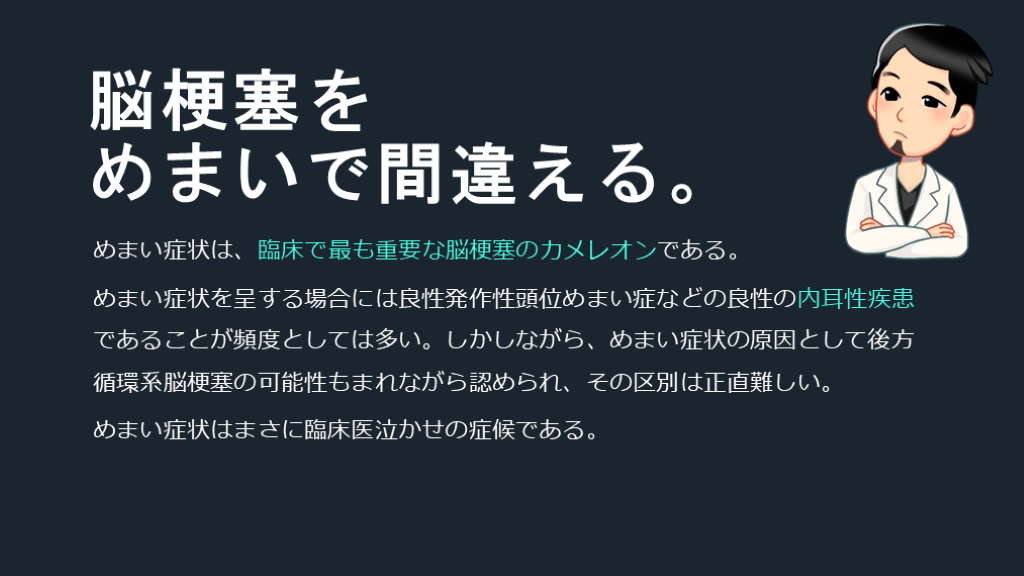 めまい症状を呈する場合には良性発作性頭位めまい症などの良性の内耳性疾患であることが頻度としては多い。しかしながら、めまい症状の原因として後方循環系脳梗塞の可能性もまれながら認められ、その区別は正直難しい。