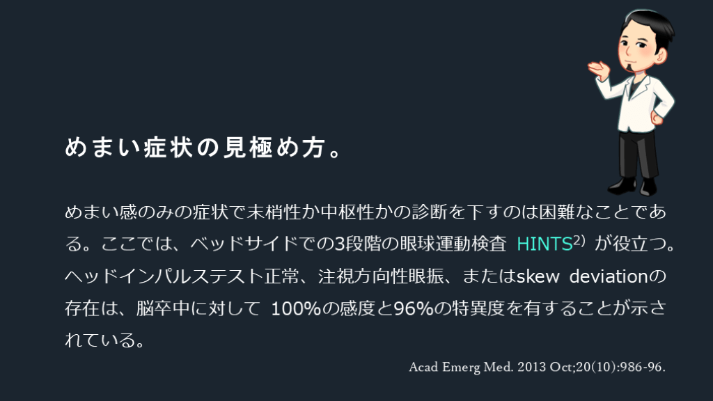#15. めまい症状の見極め方。 めまい感のみの症状で末梢性か中枢性かの診断を下すのは困難なことである。ここでは、ベッドサイドでの3段階の眼球運動検査 HINTS2) が役立つ。ヘッドインパルステスト正常、注視方向性眼振、またはskew deviationの存在は、脳卒中に対して 100%の感度と96%の特異度を有することが示されている。 Acad Emerg Med. 2013 Oct;20(10):986-96.