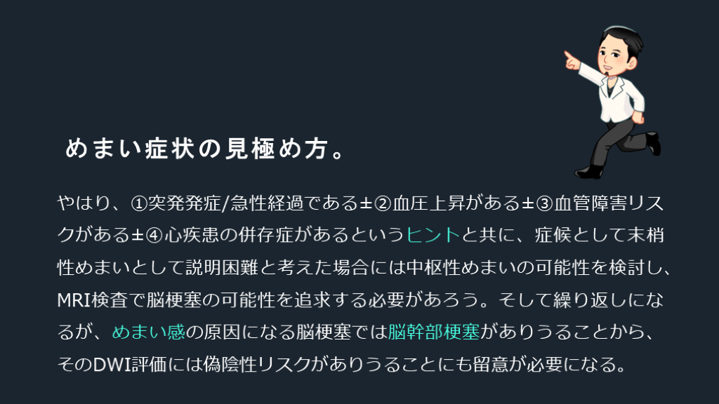 #16. めまい症状の見極め方。 やはり、①突発発症/急性経過である±②血圧上昇がある±③血管障害リスクがある±④心疾患の併存症があるというヒントと共に、症候として末梢性めまいとして説明困難と考えた場合には中枢性めまいの可能性を検討し、MRI検査で脳梗塞の可能性を追求する必要があろう。そして繰り返しになるが、めまい感の原因になる脳梗塞では脳幹部梗塞がありうることから、そのDWI評価には偽陰性リスクがありうることにも留意が必要になる。