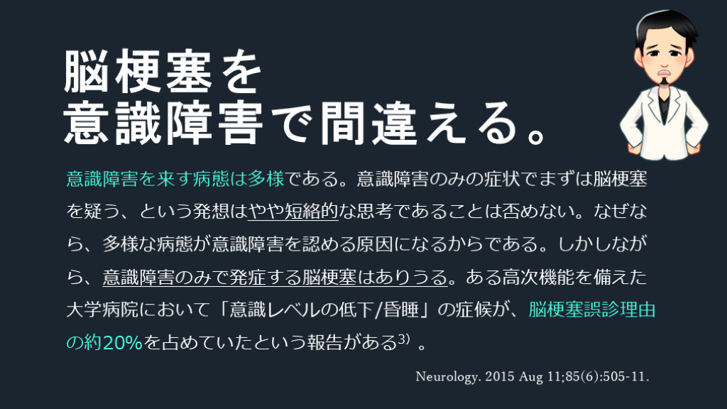 #18. 意識障害を来す病態は多様である。意識障害のみの症状でまずは脳梗塞を疑う、という発想はやや短絡的な思考であることは否めない。なぜなら、多様な病態が意識障害を認める原因になるからである。しかしながら、意識障害のみで発症する脳梗塞はありうる。ある高次機能を備えた大学病院において「意識レベルの低下/昏睡」の症候が、脳梗塞誤診理由の約20%を占めていたという報告がある3)。 脳梗塞を