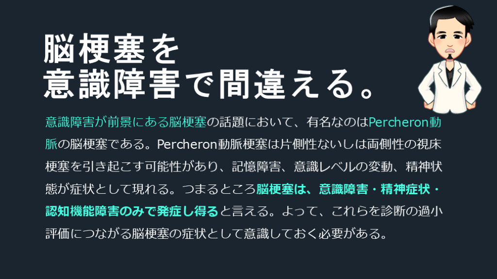 #19. 意識障害が前景にある脳梗塞の話題において、有名なのはPercheron動脈の脳梗塞である。Percheron動脈梗塞は片側性ないしは両側性の視床梗塞を引き起こす可能性があり、記憶障害、意識レベルの変動、精神状態が症状として現れる。つまるところ脳梗塞は、意識障害・精神症状・認知機能障害のみで発症し得ると言える。よって、これらを診断の過小評価につながる脳梗塞の症状として意識しておく必要がある。 脳梗塞を