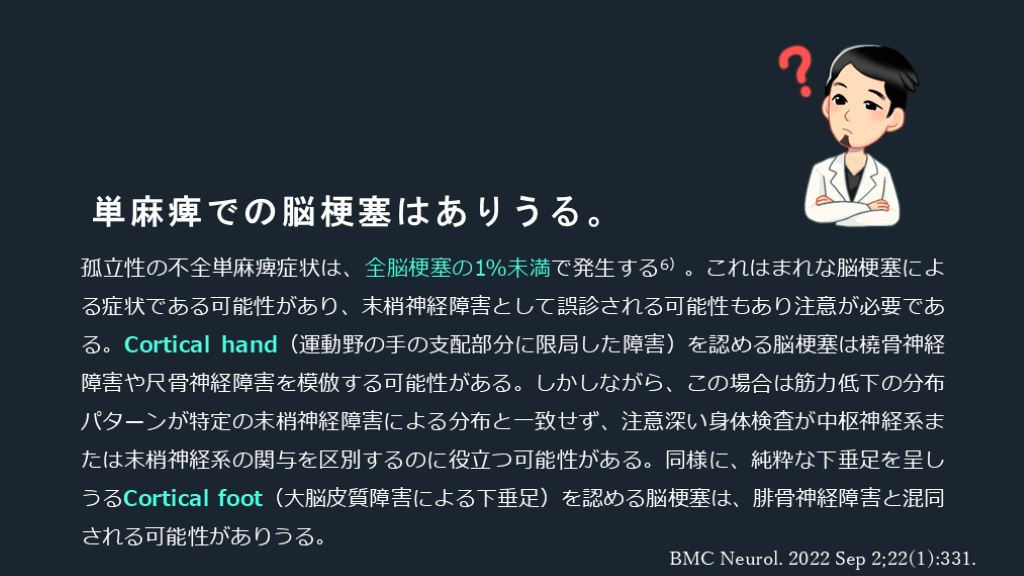 #24. 単麻痺での脳梗塞はありうる。 孤立性の不全単麻痺症状は、全脳梗塞の1%未満で発生する6)。これはまれな脳梗塞による症状である可能性があり、末梢神経障害として誤診される可能性もあり注意が必要である。Cortical hand(運動野の手の支配部分に限局した障害)を認める脳梗塞は橈骨神経障害や尺骨神経障害を模倣する可能性がある。しかしながら、この場合は筋力低下の分布パターンが特定の末梢神経障害による分布と一致せず、注意深い身体検査が中枢神経系または末梢神経系の関与を区別するのに役立つ可能性がある。同様に、純粋な下垂足を呈しうるCortical foot(大脳皮質障害による下垂足)を認める脳梗塞は、腓骨神経障害と混同される可能性がありうる。 BMC Neurol. 2022 Sep 2;22(1):331.