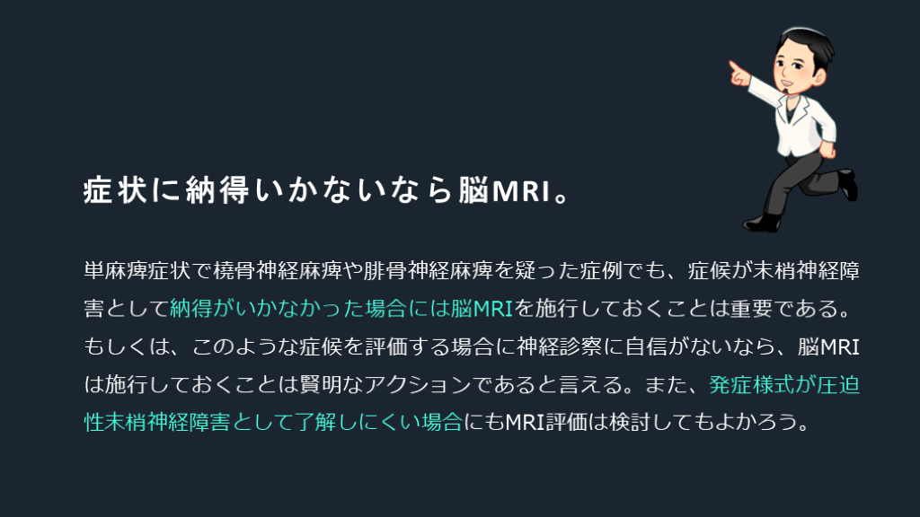 #25. 症状に納得いかないなら脳MRI。 単麻痺症状で橈骨神経麻痺や腓骨神経麻痺を疑った症例でも、症候が末梢神経障害として納得がいかなかった場合には脳MRIを施行しておくことは重要である。もしくは、このような症候を評価する場合に神経診察に自信がないなら、脳MRIは施行しておくことは賢明なアクションであると言える。また、発症様式が圧迫性末梢神経障害として了解しにくい場合にもMRI評価は検討してもよかろう。