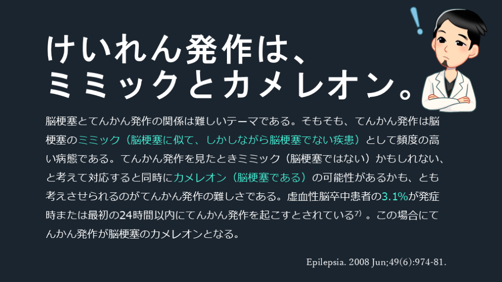 #27. 脳梗塞とてんかん発作の関係は難しいテーマである。そもそも、てんかん発作は脳梗塞のミミック(脳梗塞に似て、しかしながら脳梗塞でない疾患)として頻度の高い病態である。てんかん発作を見たときミミック(脳梗塞ではない)かもしれない、と考えて対応すると同時にカメレオン(脳梗塞である)の可能性があるかも、とも考えさせられるのがてんかん発作の難しさである。虚血性脳卒中患者の3.1%が発症時または最初の24時間以内にてんかん発作を起こすとされている7)。この場合にてんかん発作が脳梗塞のカメレオンとなる。 けいれん発作は、