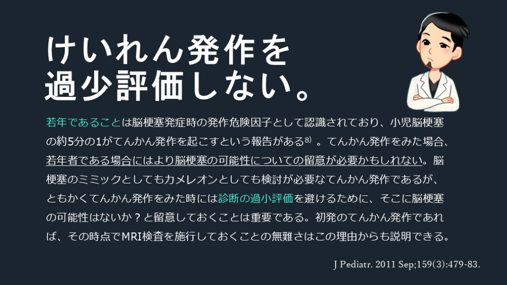 #28. 若年であることは脳梗塞発症時の発作危険因子として認識されており、小児脳梗塞の約5分の1がてんかん発作を起こすという報告がある8)。てんかん発作をみた場合、若年者である場合にはより脳梗塞の可能性についての留意が必要かもしれない。脳梗塞のミミックとしてもカメレオンとしても検討が必要なてんかん発作であるが、ともかくてんかん発作をみた時には診断の過小評価を避けるために、そこに脳梗塞の可能性はないか?と留意しておくことは重要である。初発のてんかん発作であれば、その時点でMRI検査を施行しておくことの無難さはこの理由からも説明できる。 けいれん発作を