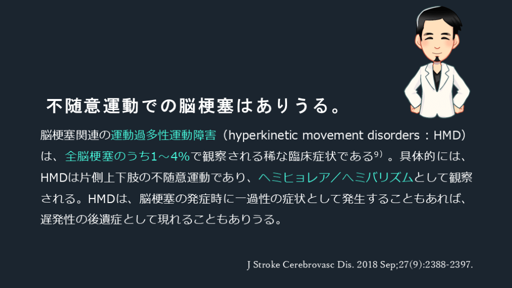 #30. 不随意運動での脳梗塞はありうる。 脳梗塞関連の運動過多性運動障害(hyperkinetic movement disorders : HMD)は、全脳梗塞のうち1~4%で観察される稀な臨床症状である9)。具体的には、HMDは片側上下肢の不随意運動であり、ヘミヒョレア/へミバリズムとして観察される。HMDは、脳梗塞の発症時に一過性の症状として発生することもあれば、遅発性の後遺症として現れることもありうる。 J Stroke Cerebrovasc Dis. 2018 Sep;27(9):2388-2397.