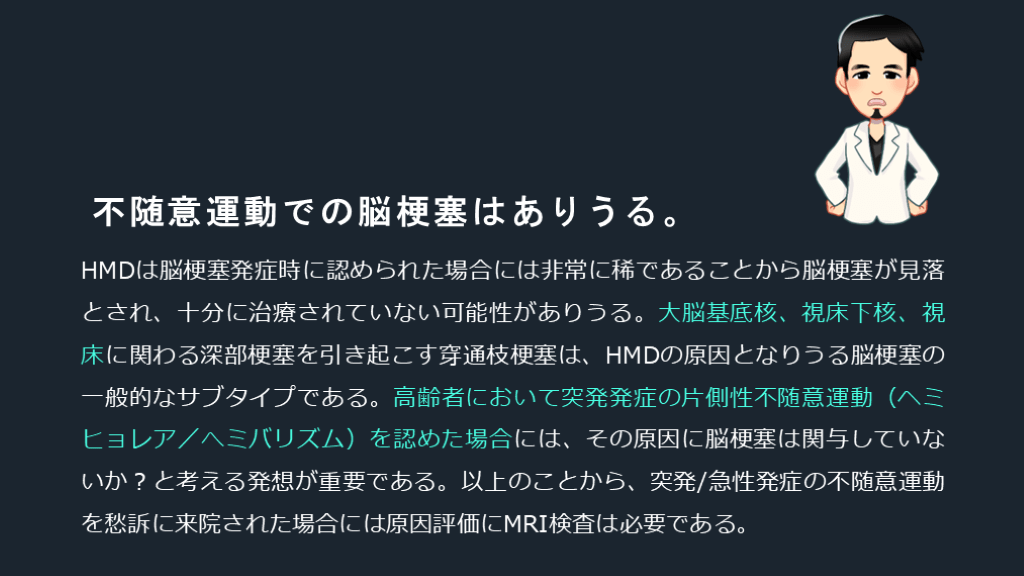 #31. 不随意運動での脳梗塞はありうる。 HMDは脳梗塞発症時に認められた場合には非常に稀であることから脳梗塞が見落とされ、十分に治療されていない可能性がありうる。大脳基底核、視床下核、視床に関わる深部梗塞を引き起こす穿通枝梗塞は、HMDの原因となりうる脳梗塞の一般的なサブタイプである。高齢者において突発発症の片側性不随意運動(ヘミヒョレア/へミバリズム)を認めた場合には、その原因に脳梗塞は関与していないか?と考える発想が重要である。以上のことから、突発/急性発症の不随意運動を愁訴に来院された場合には原因評価にMRI検査は必要である。