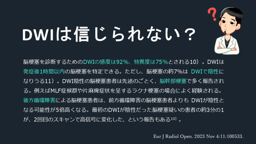 #33. 脳梗塞を診断するためのDWIの感度は92%、特異度は75%とされる10)。DWIは発症後1時間以内の脳梗塞を特定できる。ただし、脳梗塞の約7%は DWIで陰性になりうる11)。DWI陰性の脳梗塞患者は先述のごとく、脳幹部梗塞で多く報告される。例えばMLF症候群や片麻痺症状を呈するラクナ梗塞の場合によく経験される。後方循環障害による脳梗塞患者は、前方循環障害の脳梗塞患者よりも DWIが陰性となる可能性が5倍高くなる。最初のDWIが陰性だった脳梗塞疑いの患者の約3分の1が、2回目のスキャンで高信号に変化した、という報告もある10)。 DWIは信じられない? Eur J Radiol Open. 2023 Nov 4:11:100533.